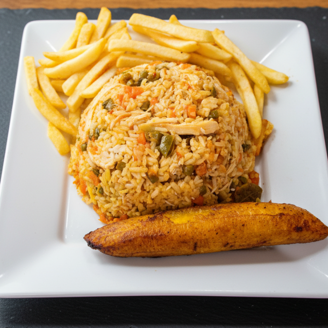 Arroz con Pollo (Arroz, Pollo desmechado, Verduras (zanahoria y habichuela) acompañado de papas francesa y maduro entero.