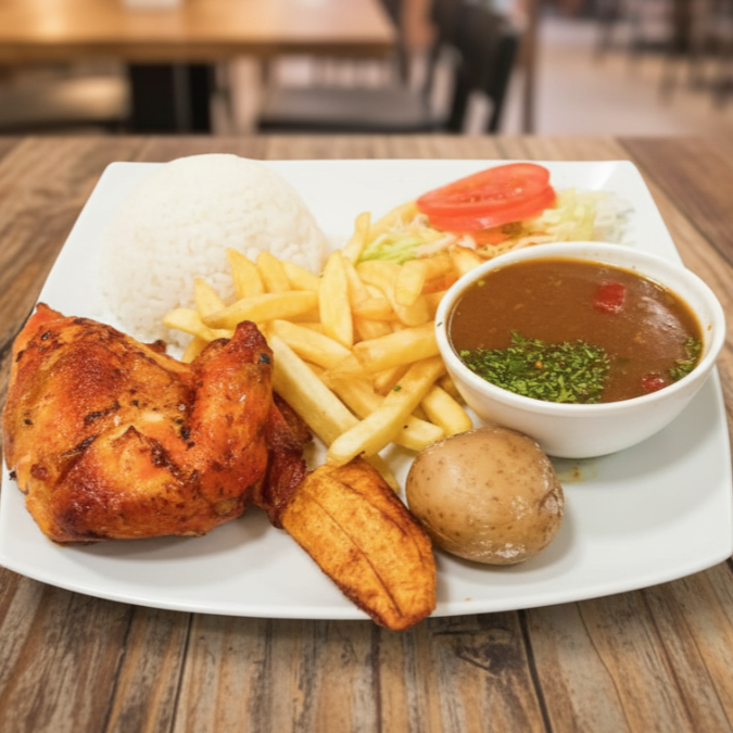 Cuarto de pollo asado con presas a elección acompañado de porción de arroz, ensalada del día, principio del día a elección (Frijoles o Lentejas) y papas a la francesa.