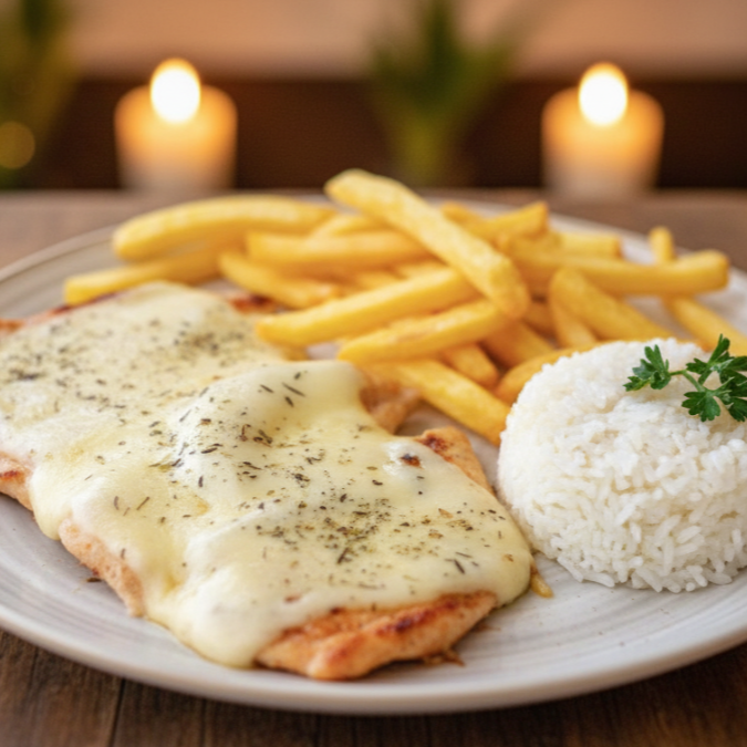 Pechuga gratinada en delicioso queso acompañada de papa francesa y porción de arroz.