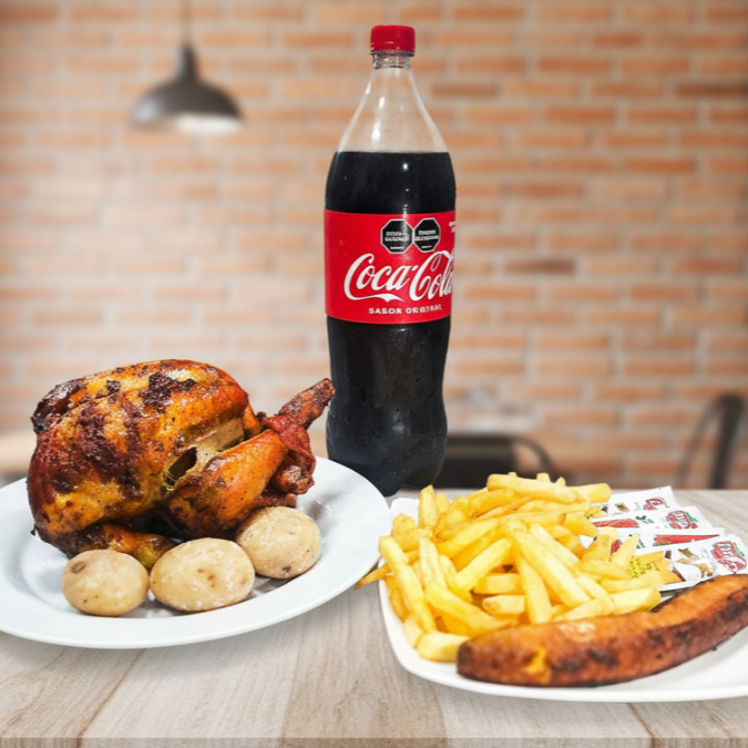 1 pollo asado (8 presas) acompañado de papas a la francesa, delicioso maduro y gaseosa 1.5 L a elección.