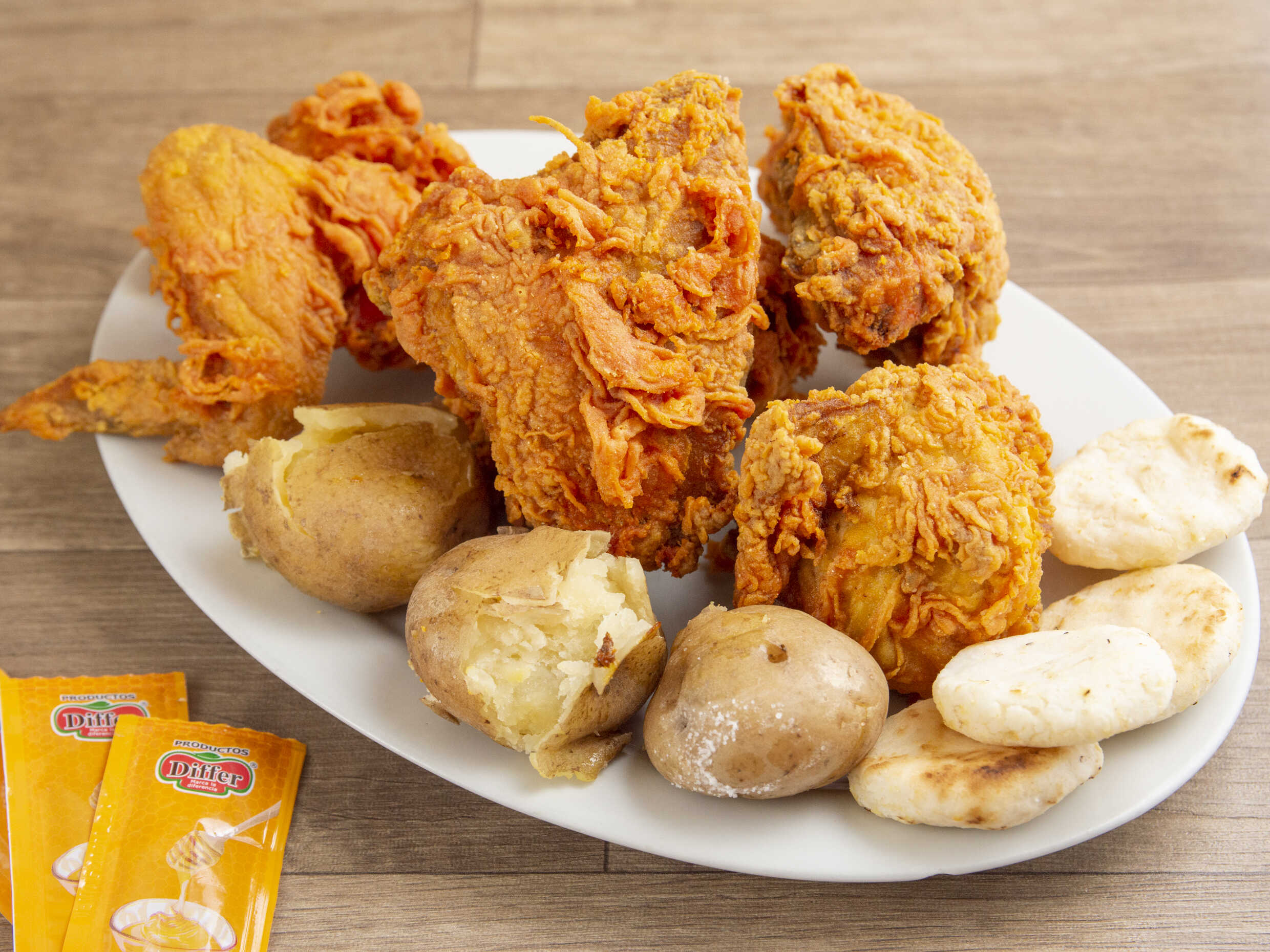 Delicioso pollo sazonado en especias, frito en aceite. Son 8 deliciosas presas acompañadas de papa y maduro.