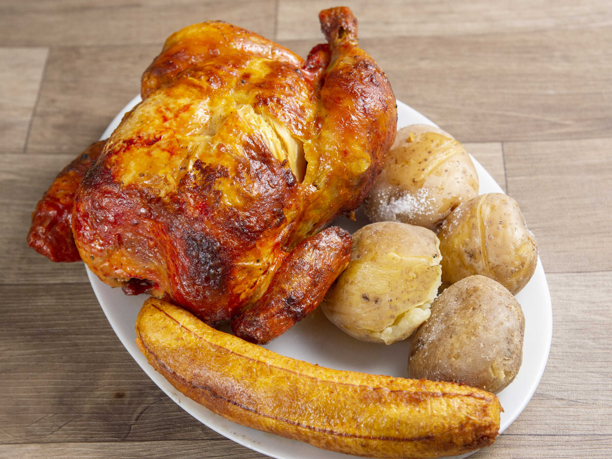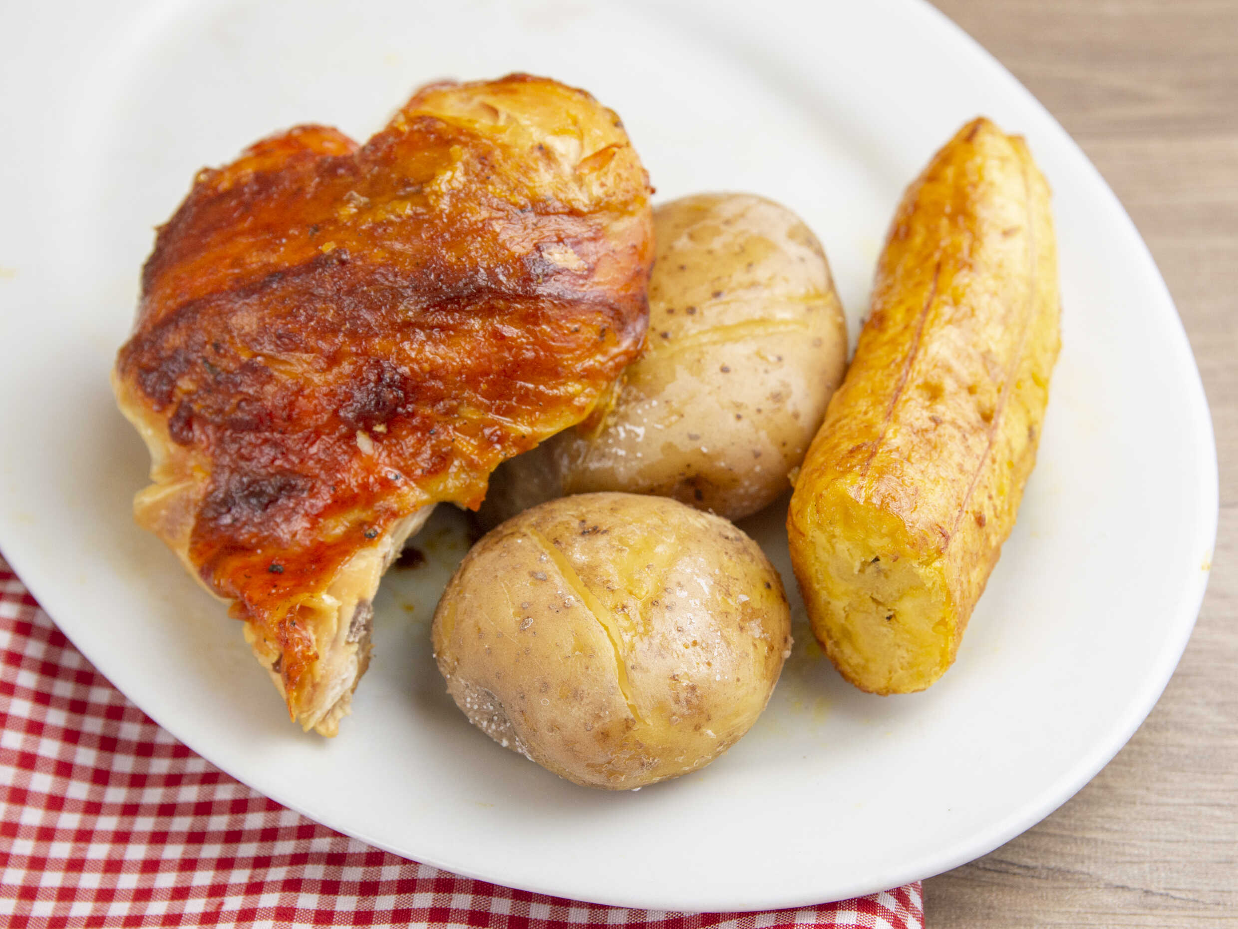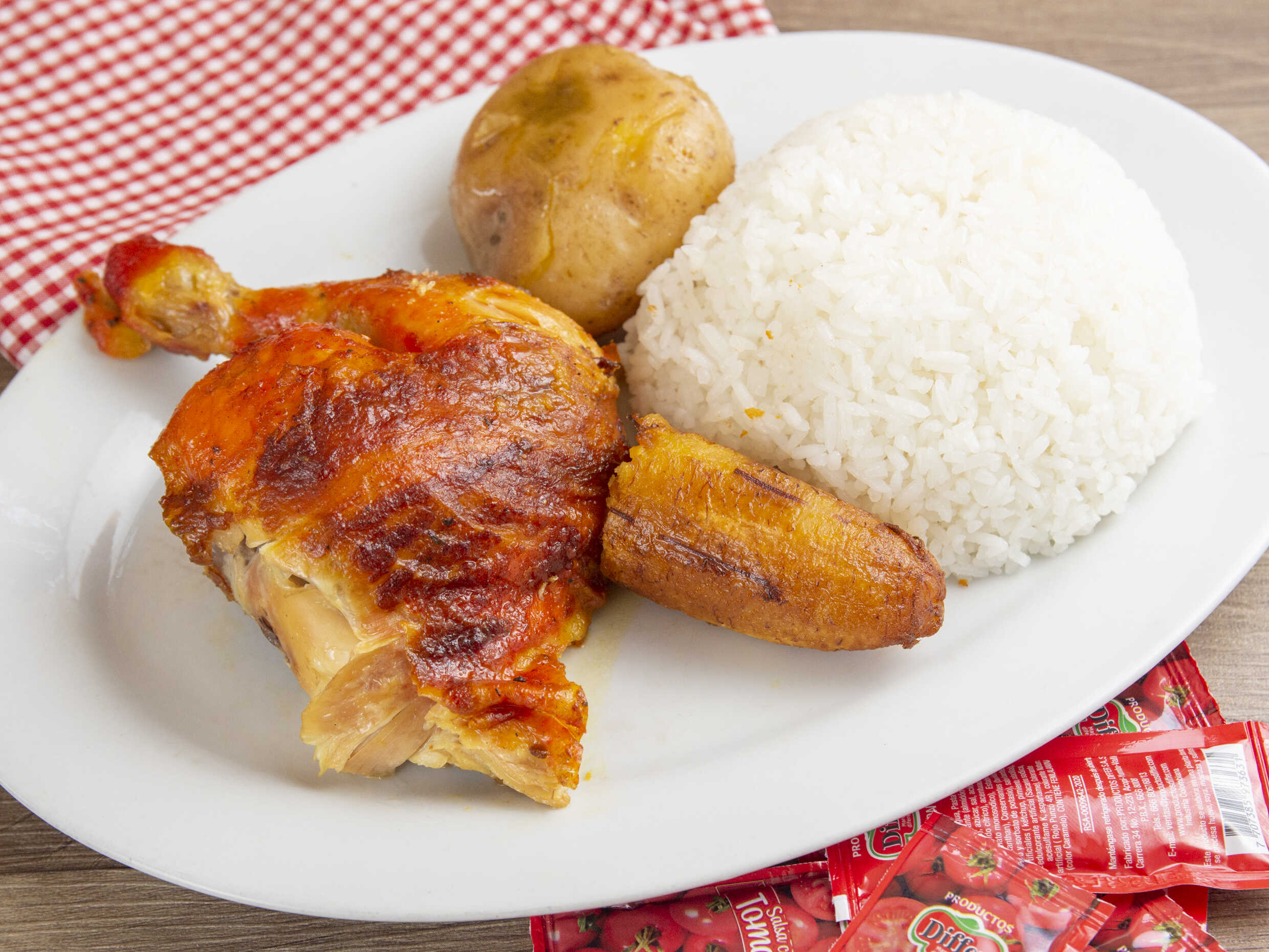 1/4 pollo asado + porcion papa y de maduro + porción de arroz.