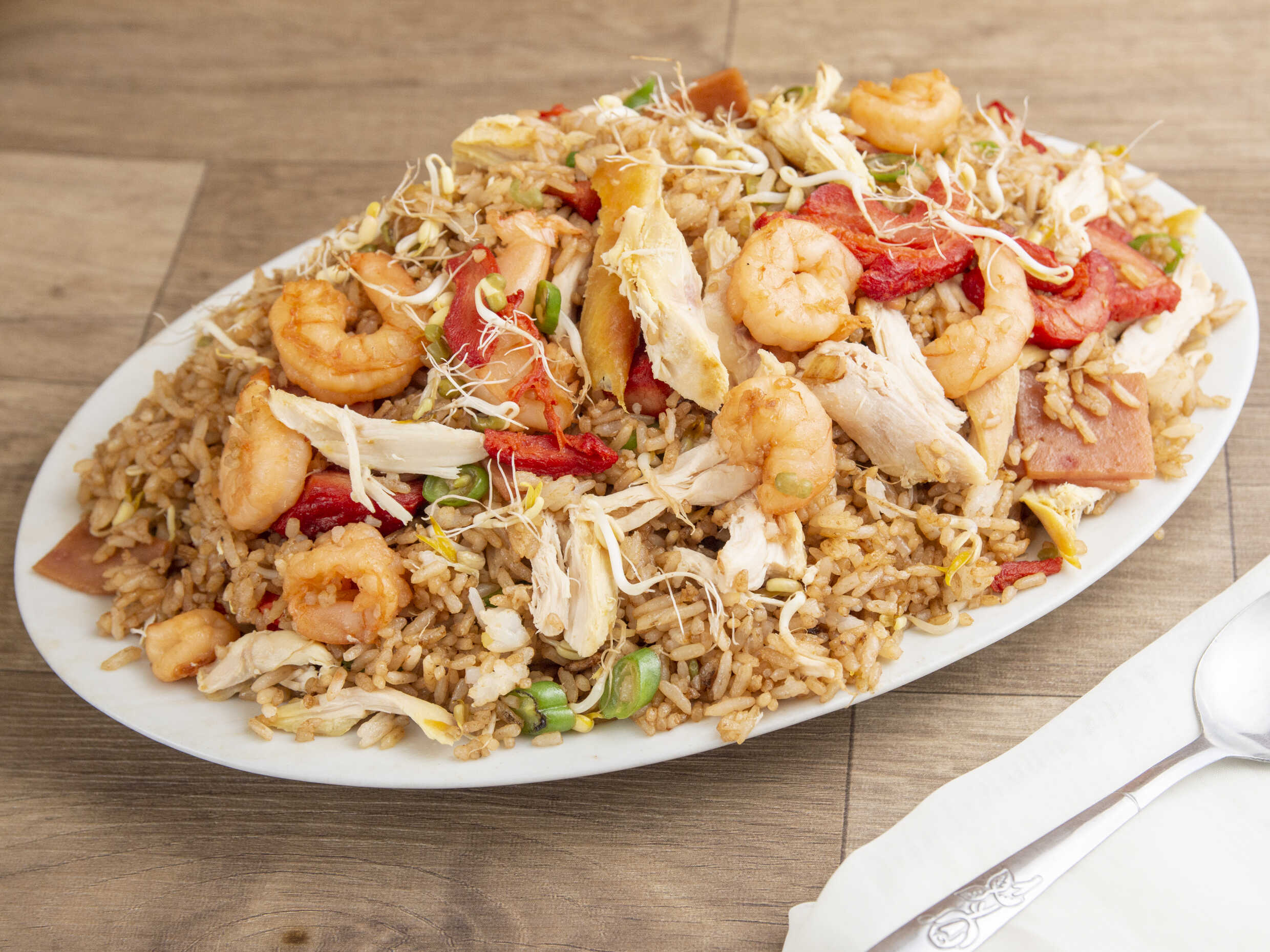 Caja grande de arroz chino: 4 a 5 porciones, Contiene jamón, camarón, pollo desmechado, verduras, raíces chinas, arroz.