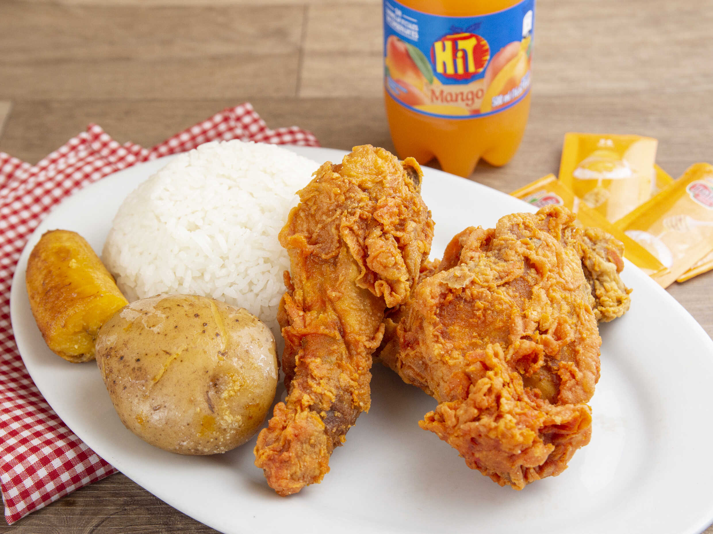 1/4 pollo apanado + porcion de papa y maduro + arroz + jugo hit 500ml