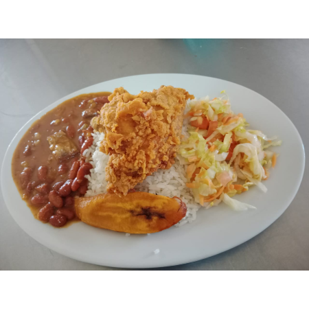 Bandeja con frijoles, arroz blanco, ensalada, 1 presa de pollo apanado, limonada