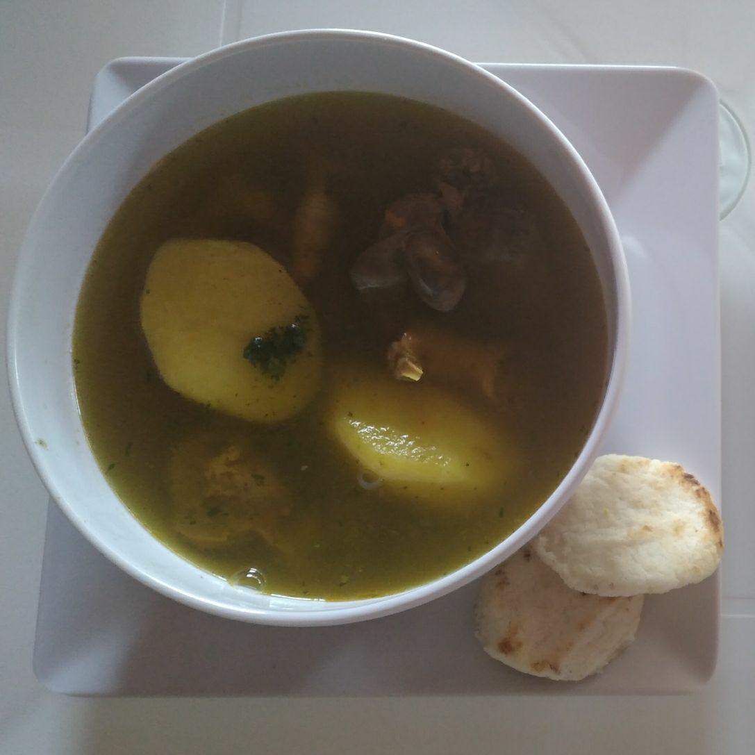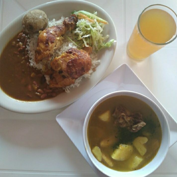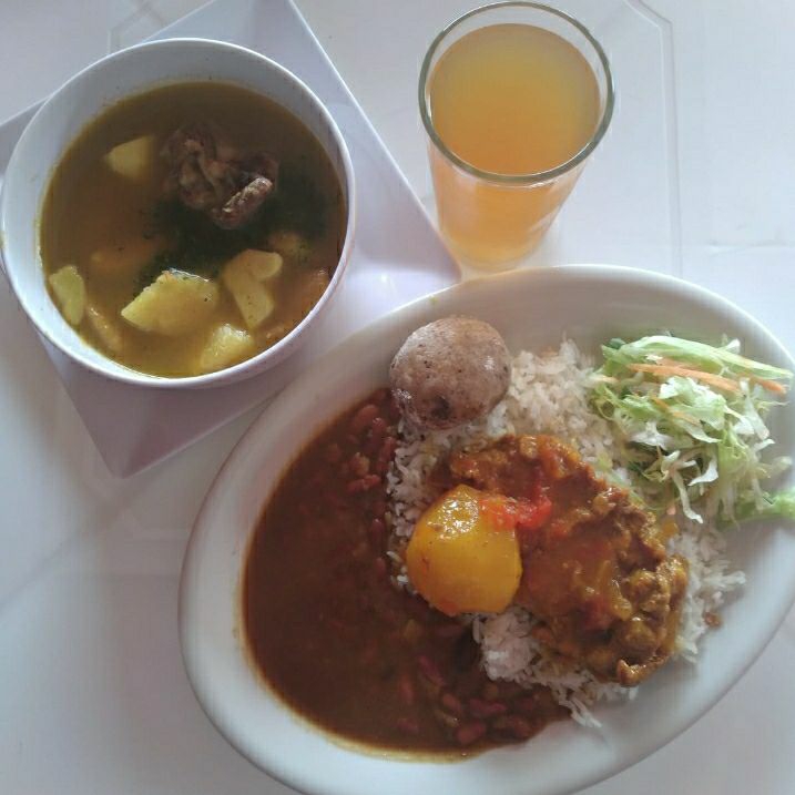 Sopa , principio, arroz, ensalada y chuleta de CERDO