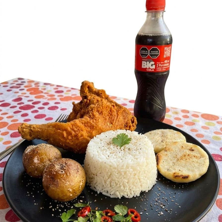 pernil+papa+arepa+porcion de arroz+bigcola personal
