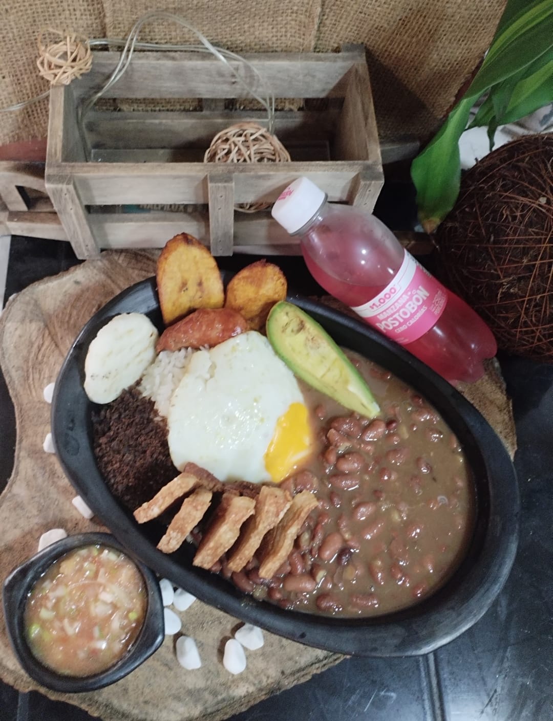 Bandeja Paisa completa con Frijoles, Arroz, Chorizo, Chicharrón, Carne Molida, Huevo, Tajadas Maduras, Aguacate y Arepa.