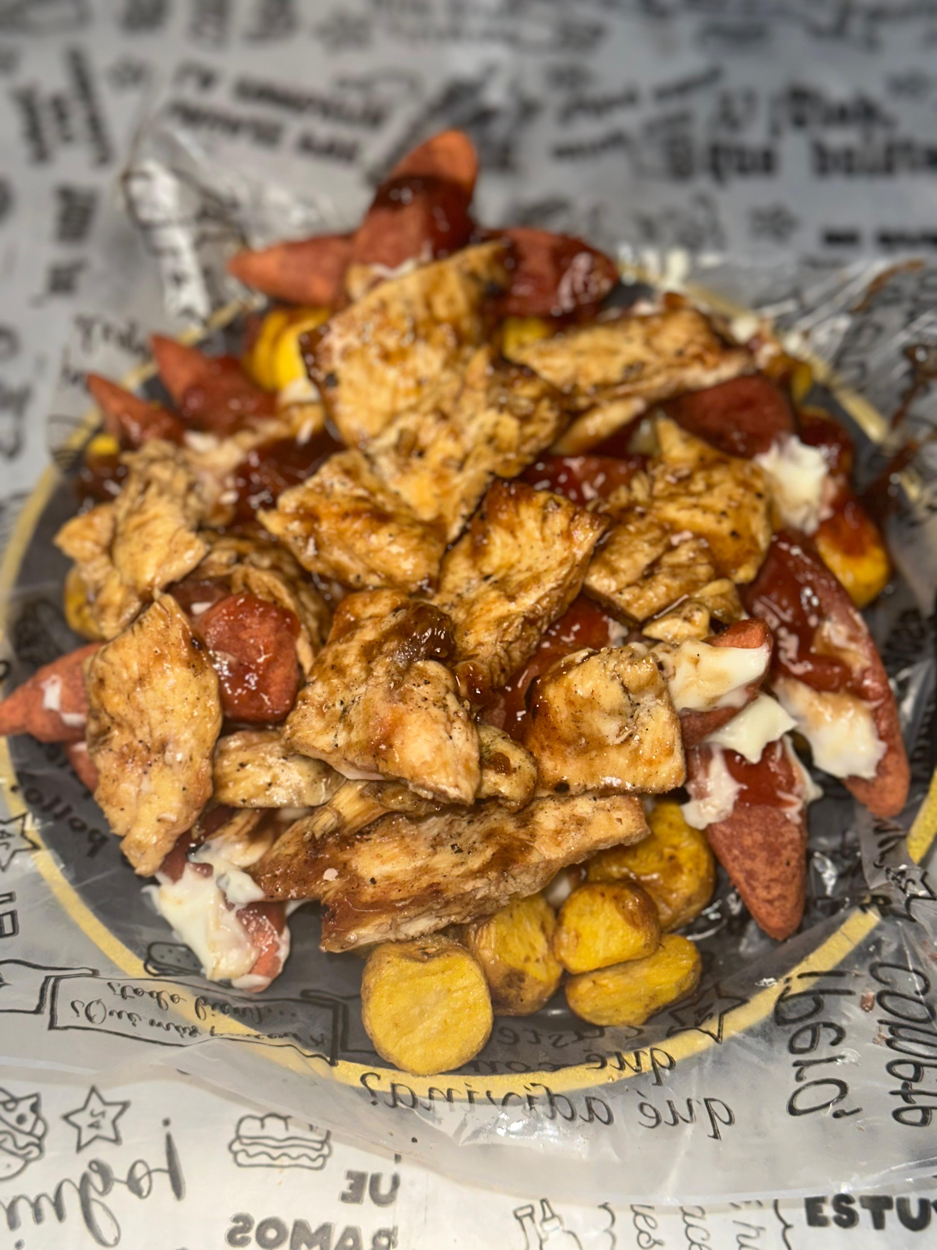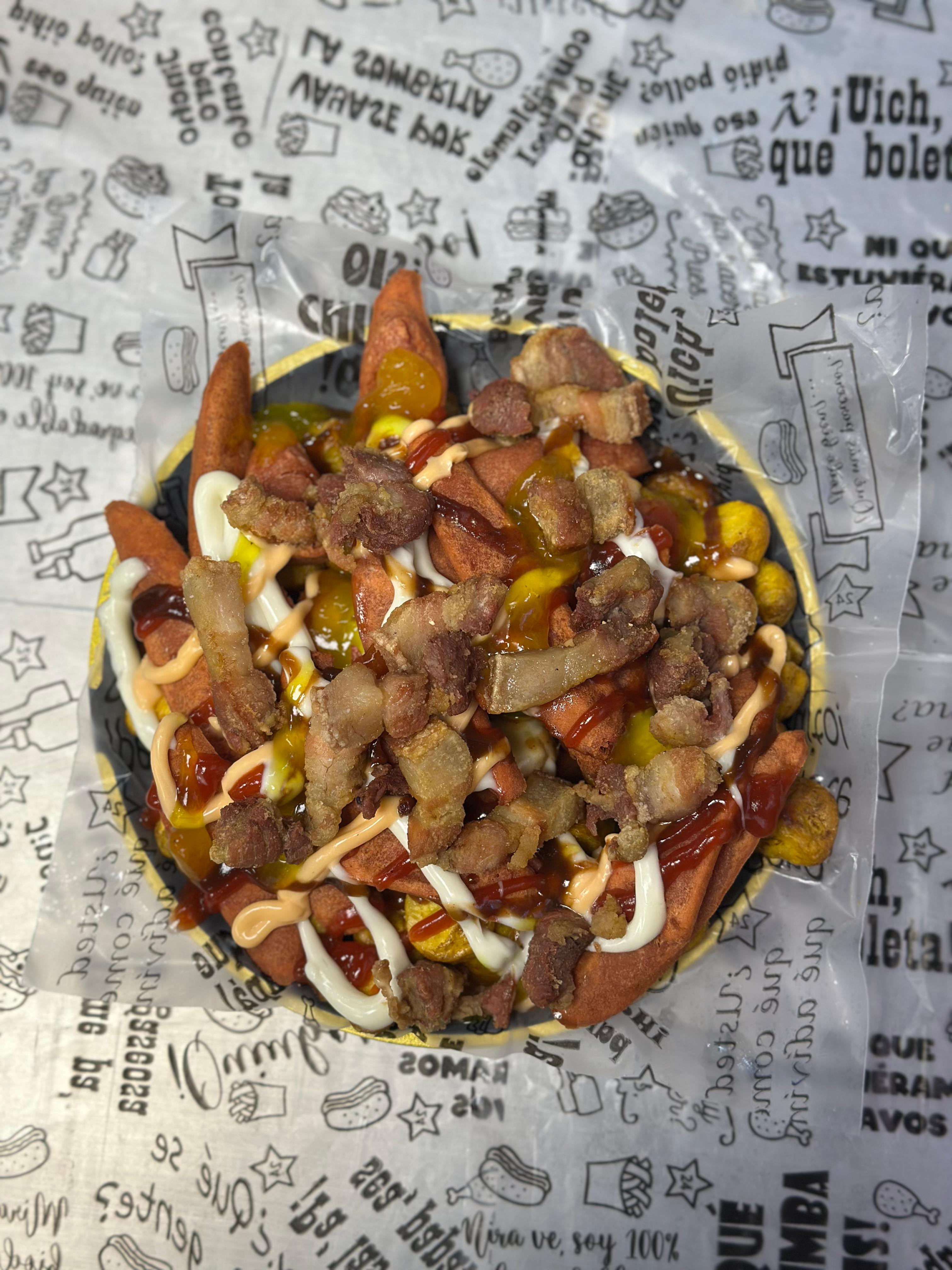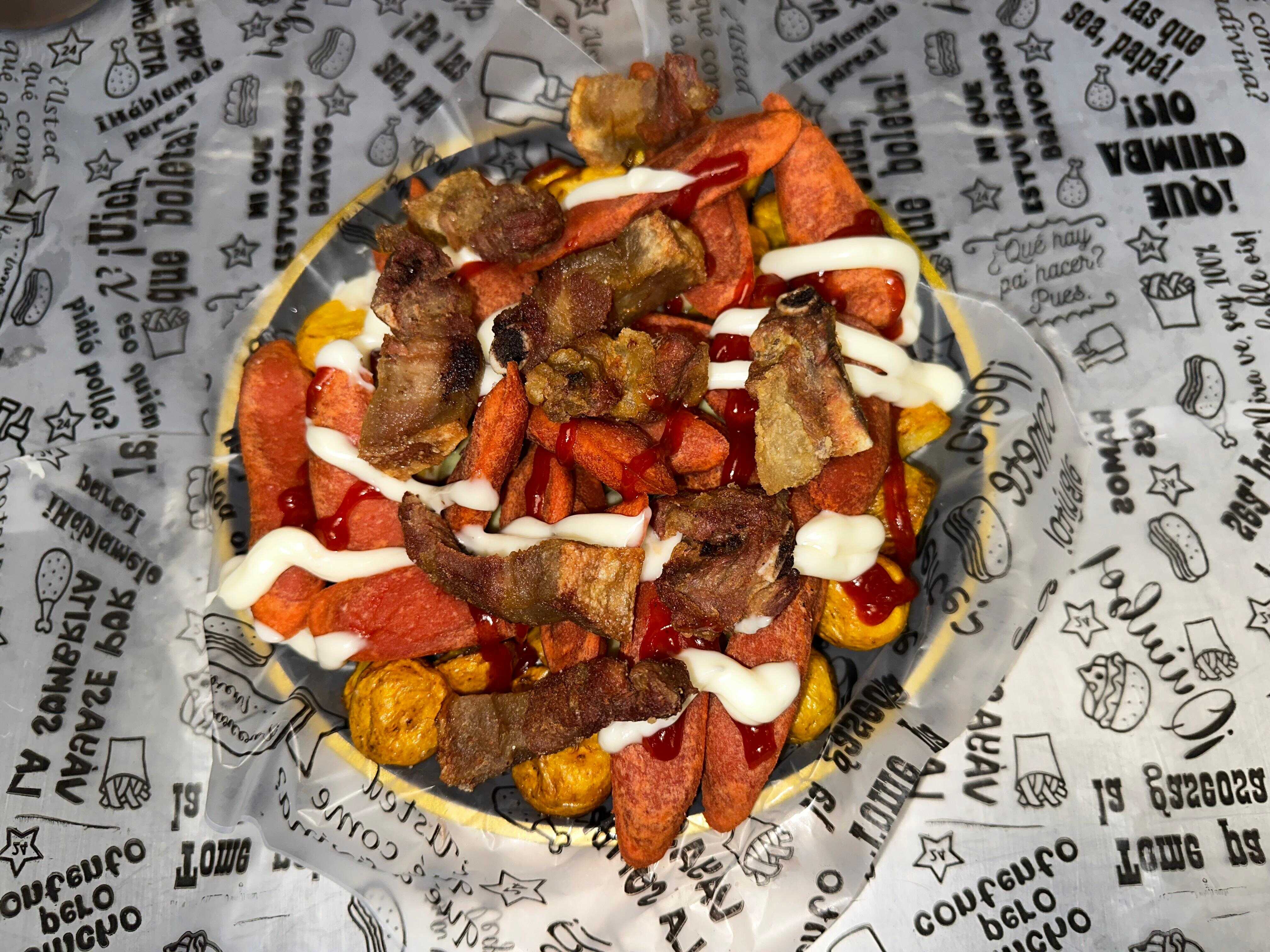Deliciosa Salchi Chicharrones acompañado de Papa amarilla, queso, salchicha, chicharrón y salsa de la casa.