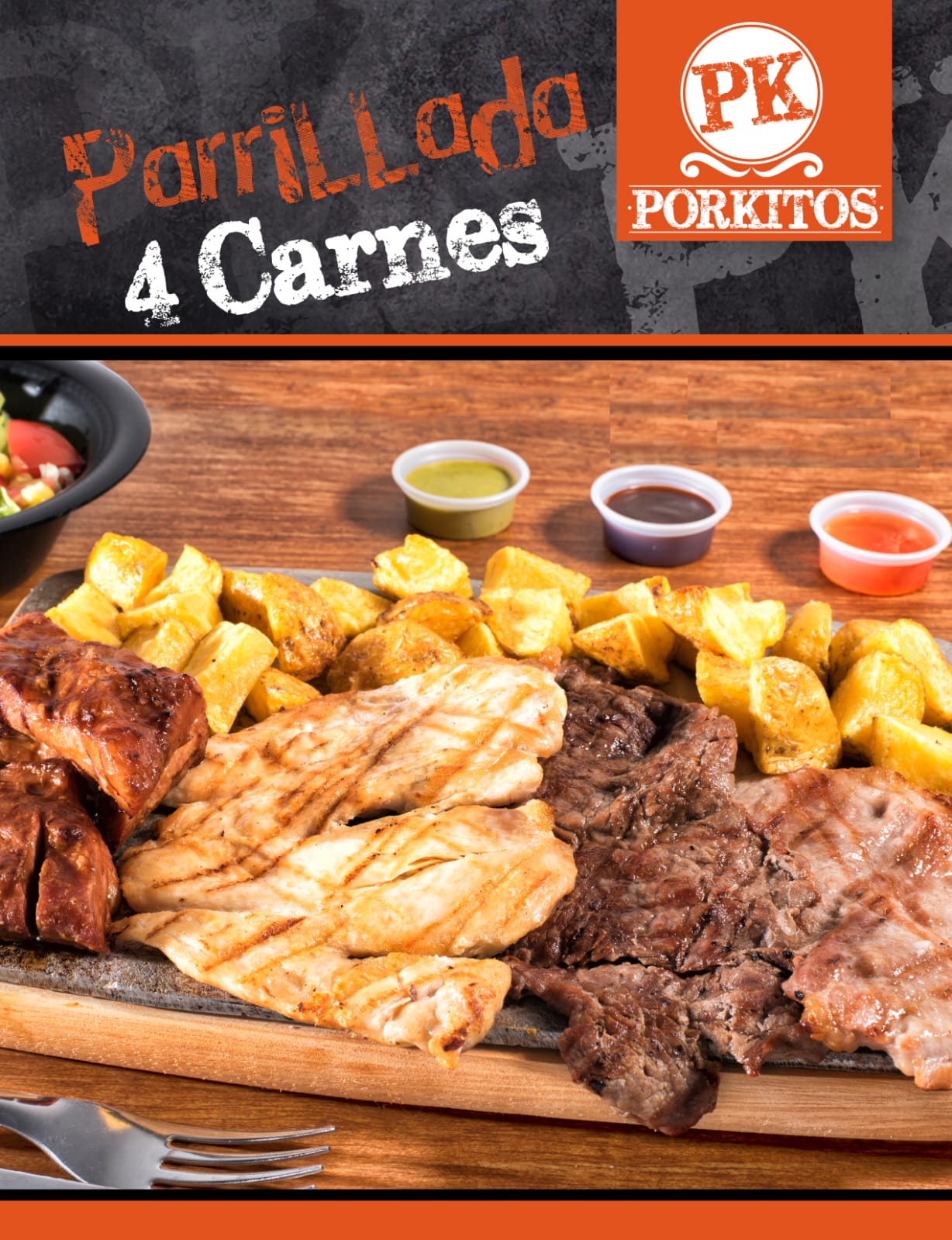 1 porcion personal de Parrillada 4 Carnes (costilla,pollo,res,cerdo) + 1 porcion de papa amarilla + ensalada (lechuga tomate zanahoria y vinagreta )