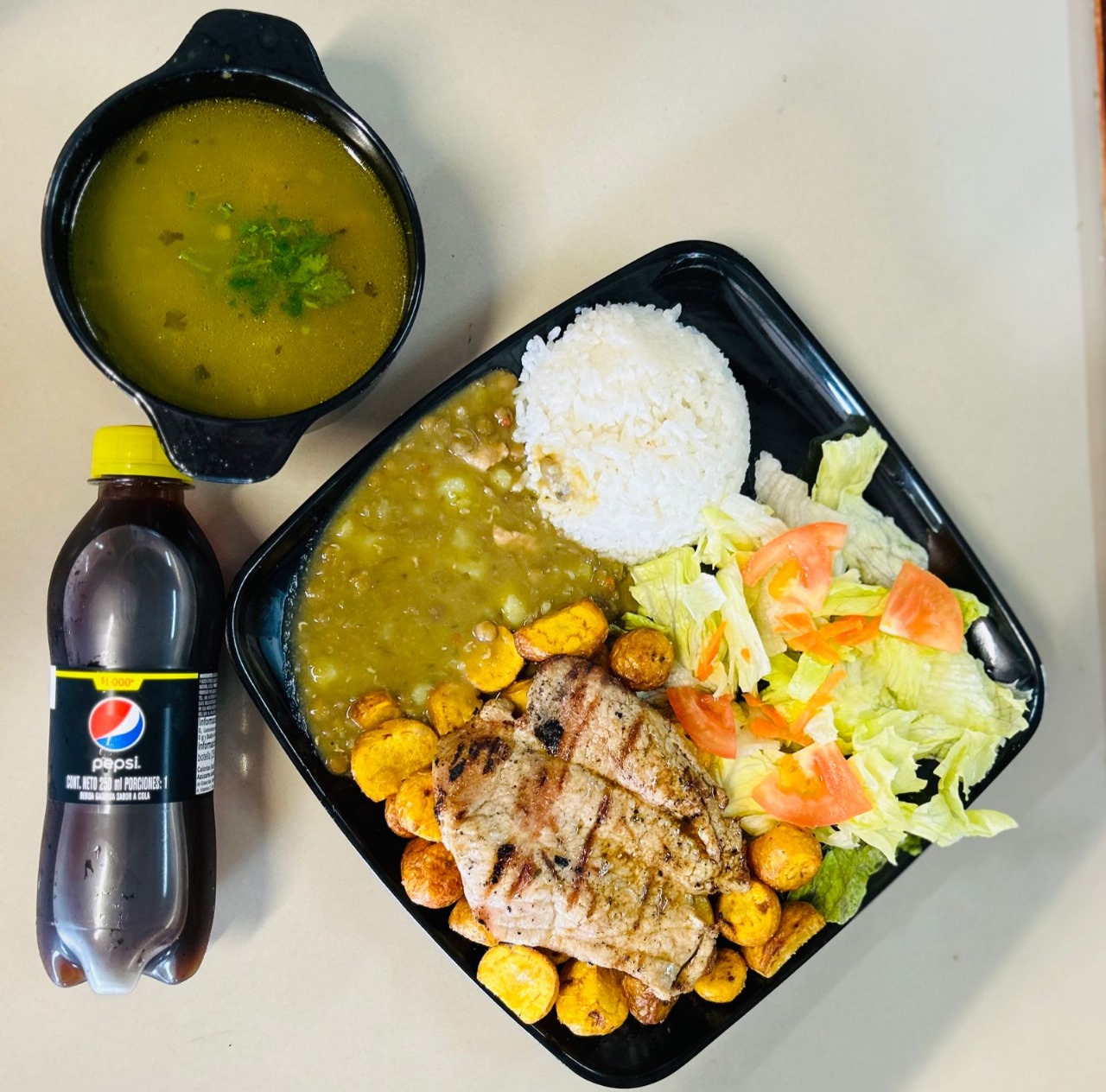 Gaseosa 250ml ( segun disponibilidad ) + 1 Sopa del Día + 1 Proteína (pollo a la plancha) + 1 porcion de papa amarilla