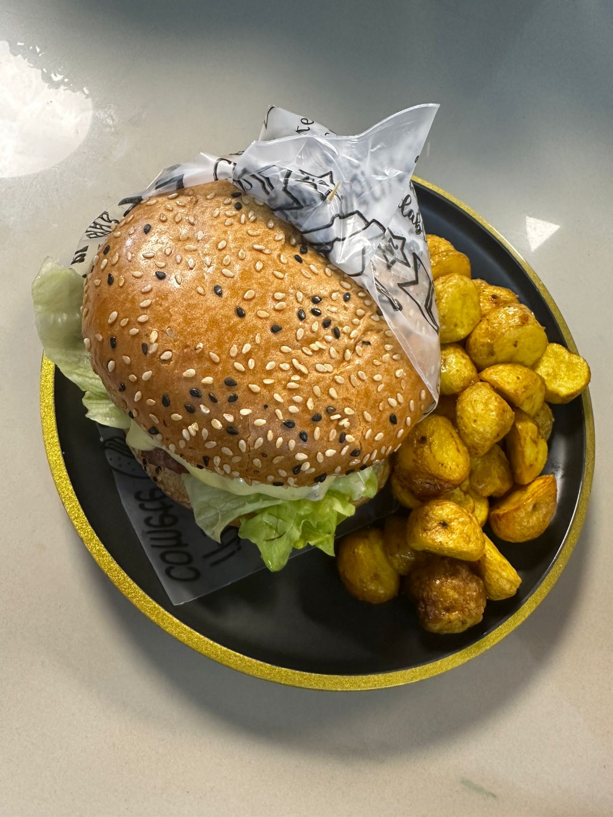 Hamburguesa Porkitos: Carne acompañados de Salsa BBQ, Queso Mozzarella, Cebolla, Tomate + Porción Papa + Bebida 400 ml.