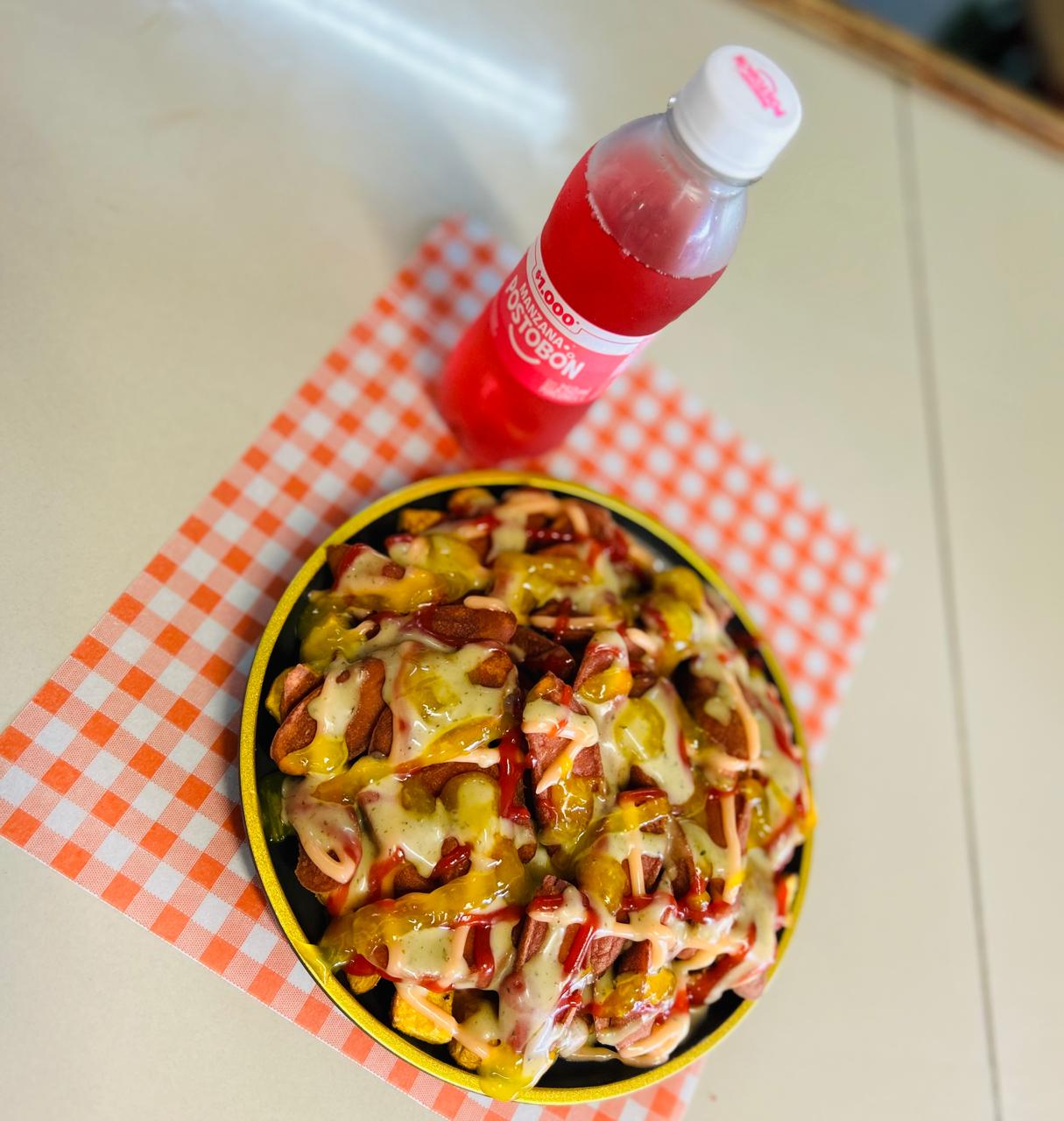 Salchipapa, Papa Amarilla, Salchicha, Queso y Salsas de la Casa (Sugerida hasta para 2 personas), Acompañada de 1 Bebida 250ml.