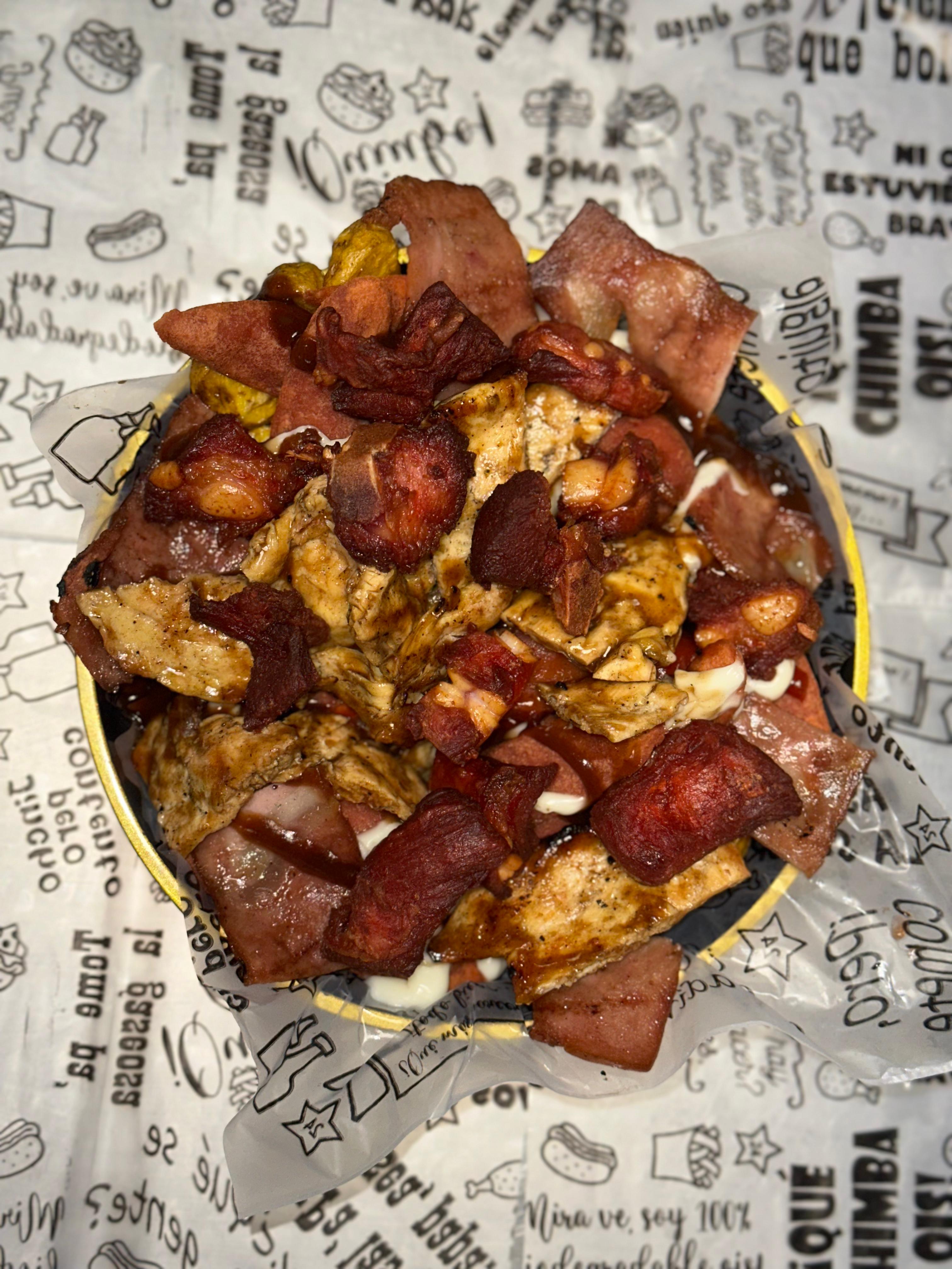 Deliciosa Salchi Todo para Dos acompañado de Papa amarilla, queso, salchicha, costilla, pollo y tocineta y salsa de la casa.