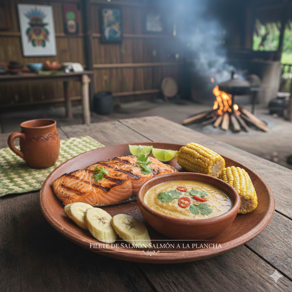 Salmón a la plancha bañado en exquisita salsa de chontaduro de la casa. Un toque dulce y exótico.