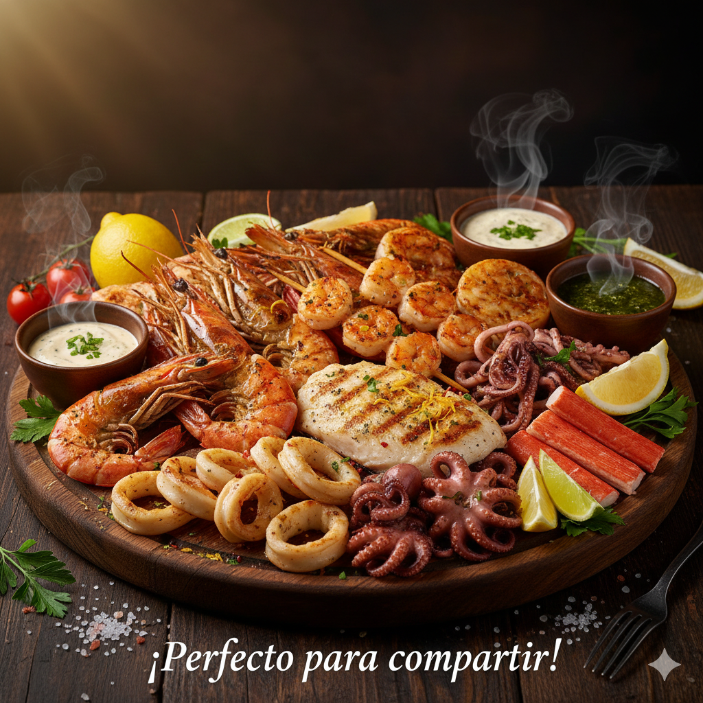 Surtido de jugosos langostinos, camarones, filete de pescado, anillos de calamar, pulpo baby y palmitos de cangrejo asados. ¡Perfecto para compartir!