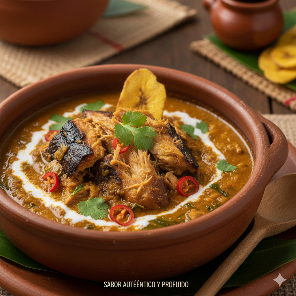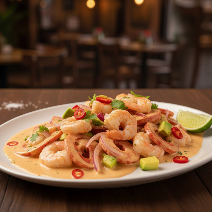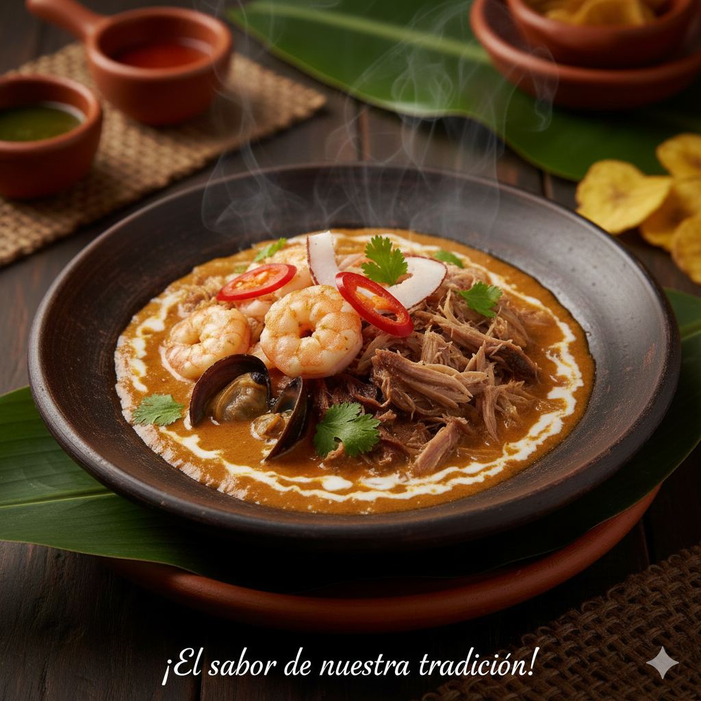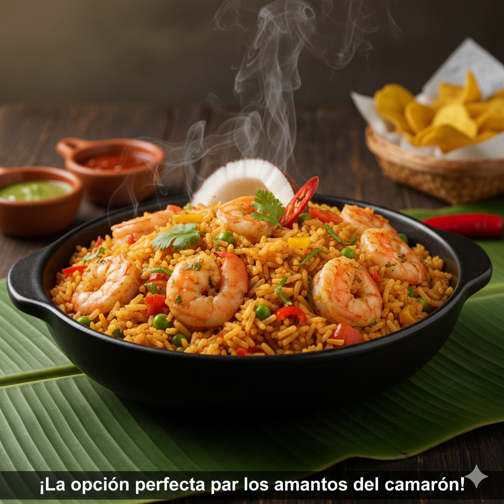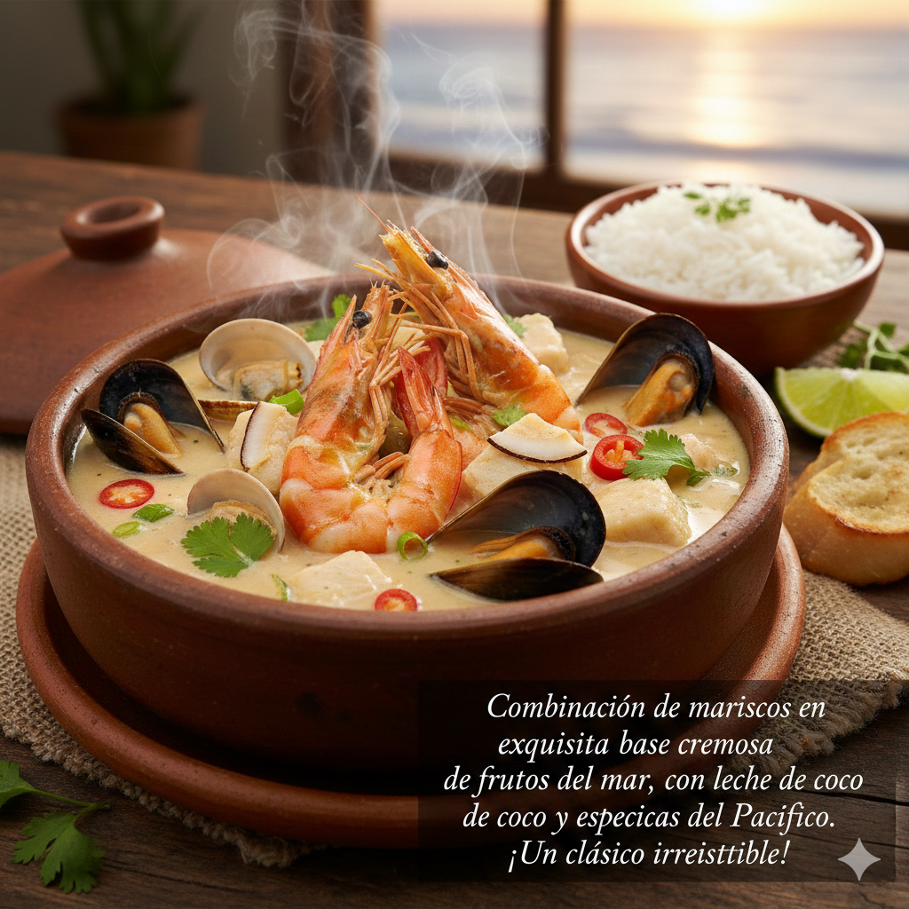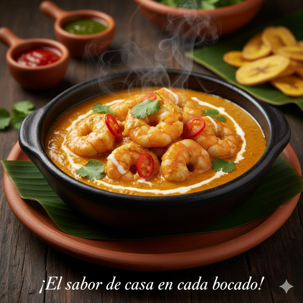 Camarones en exquisita base cremosa de frutos del mar, con leche de coco y especias. Sabor tradicional en cada cucharada.