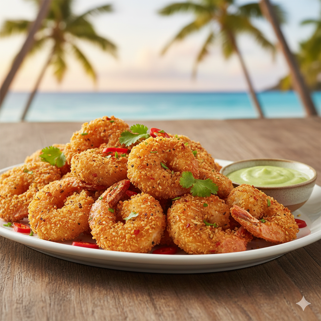 Crujientes camarones apanados con un sabor del Pacífico, perfectos para empezar.