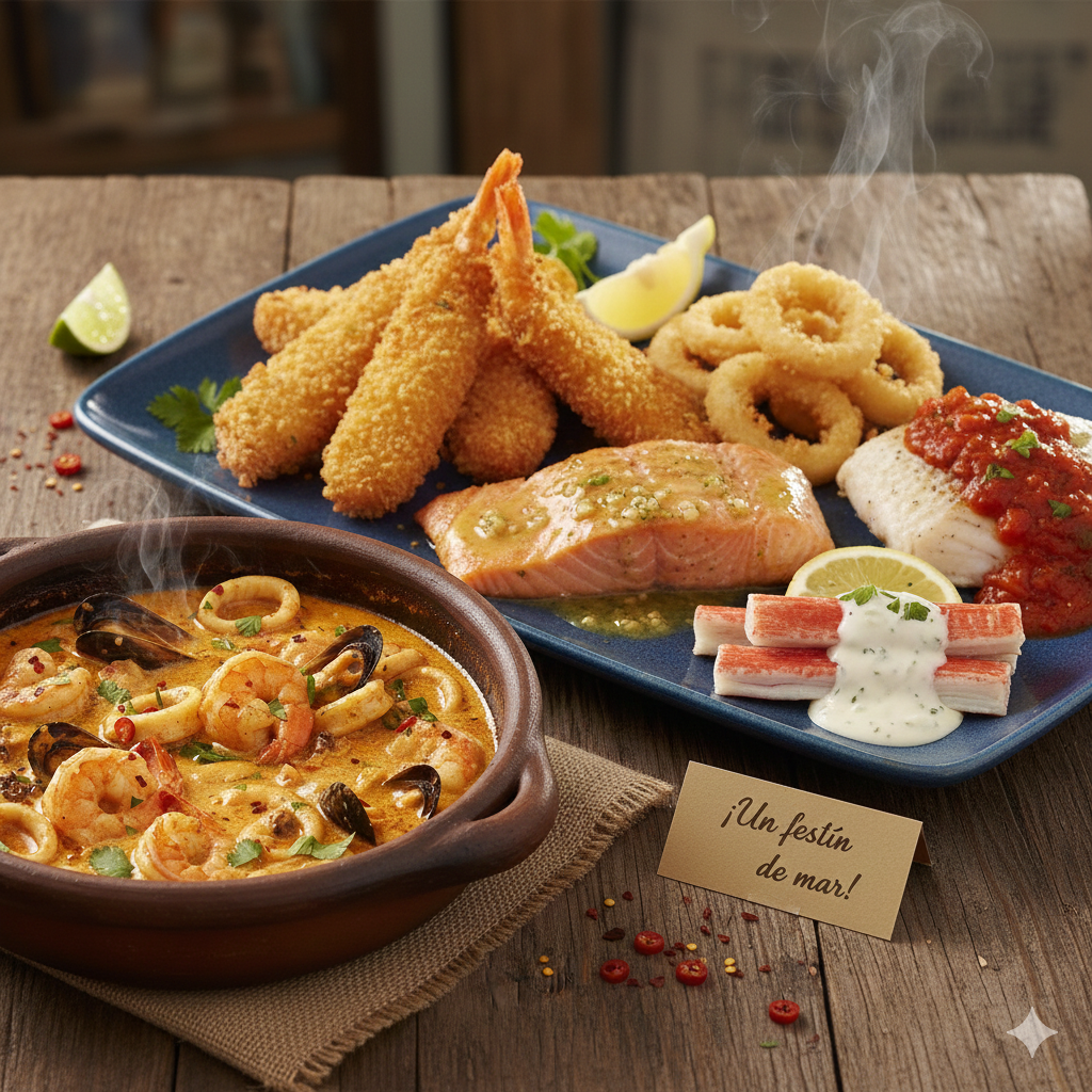 Inspiración del Chef: inicia con una exquisita mini cazuela de mariscos, seguida de un plato fuerte con langostinos apanados, filete de salmón en salsa al ajillo, filete de pescado blanco en salsa marinera, anillos de calamar apanados y palmitos de cangrejo en salsa blanca. ¡Un festín de mar!