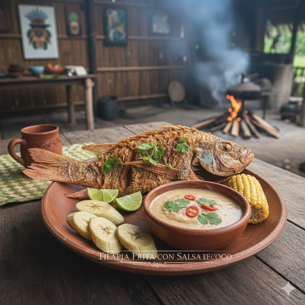 tilapia frita deliciosa salsa de coco ancestral del Pacífico. Un plato de tradición.