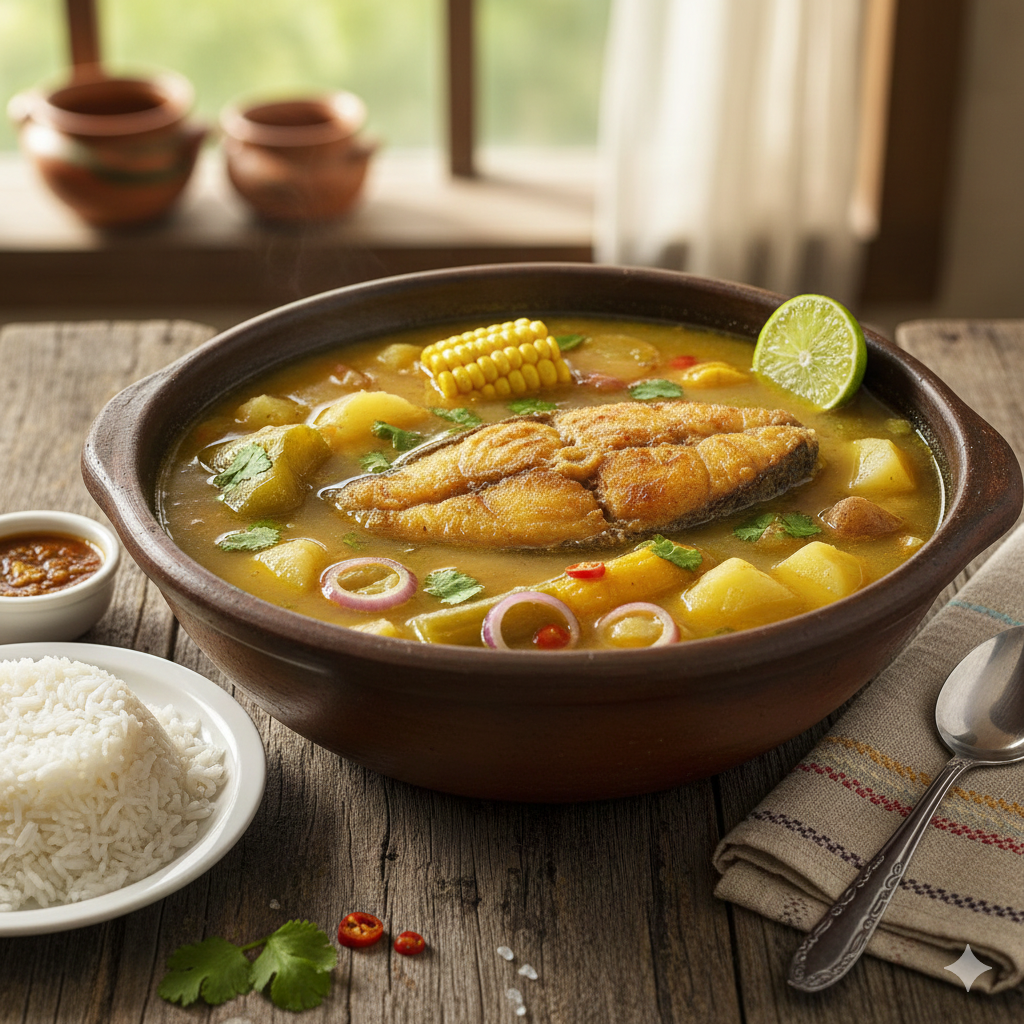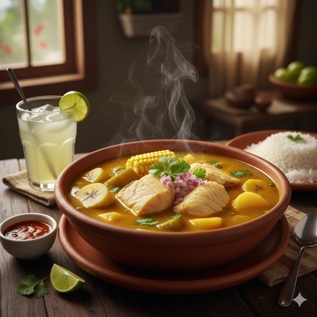 Sancocho de pescado típico del Pacífico, con una posta de bagre de mar frita o sudada. ¡Reconfortante y lleno de sabor!