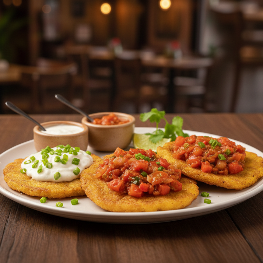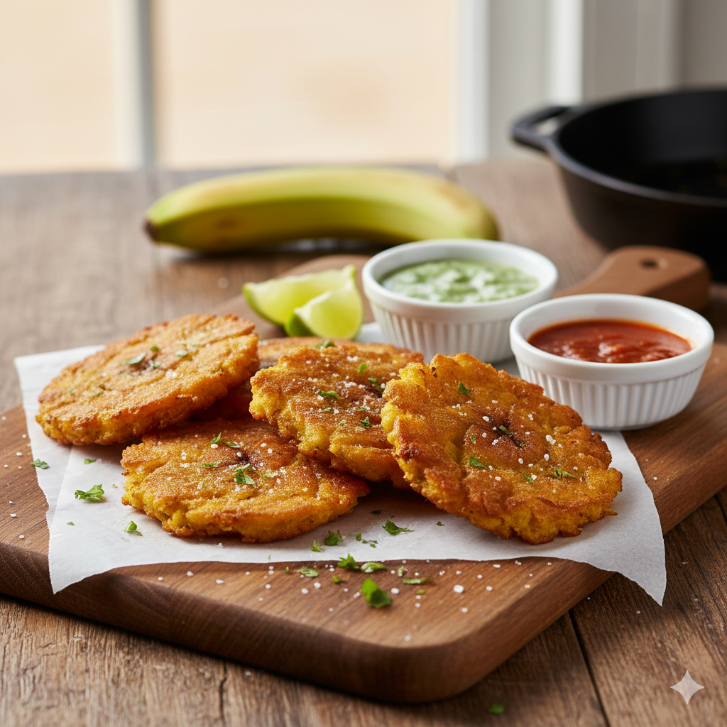Patacones (4 unidades) crujientes, servidos con Suero Costeño o Guiso Criollo. El acompañamiento perfecto para tu plato.