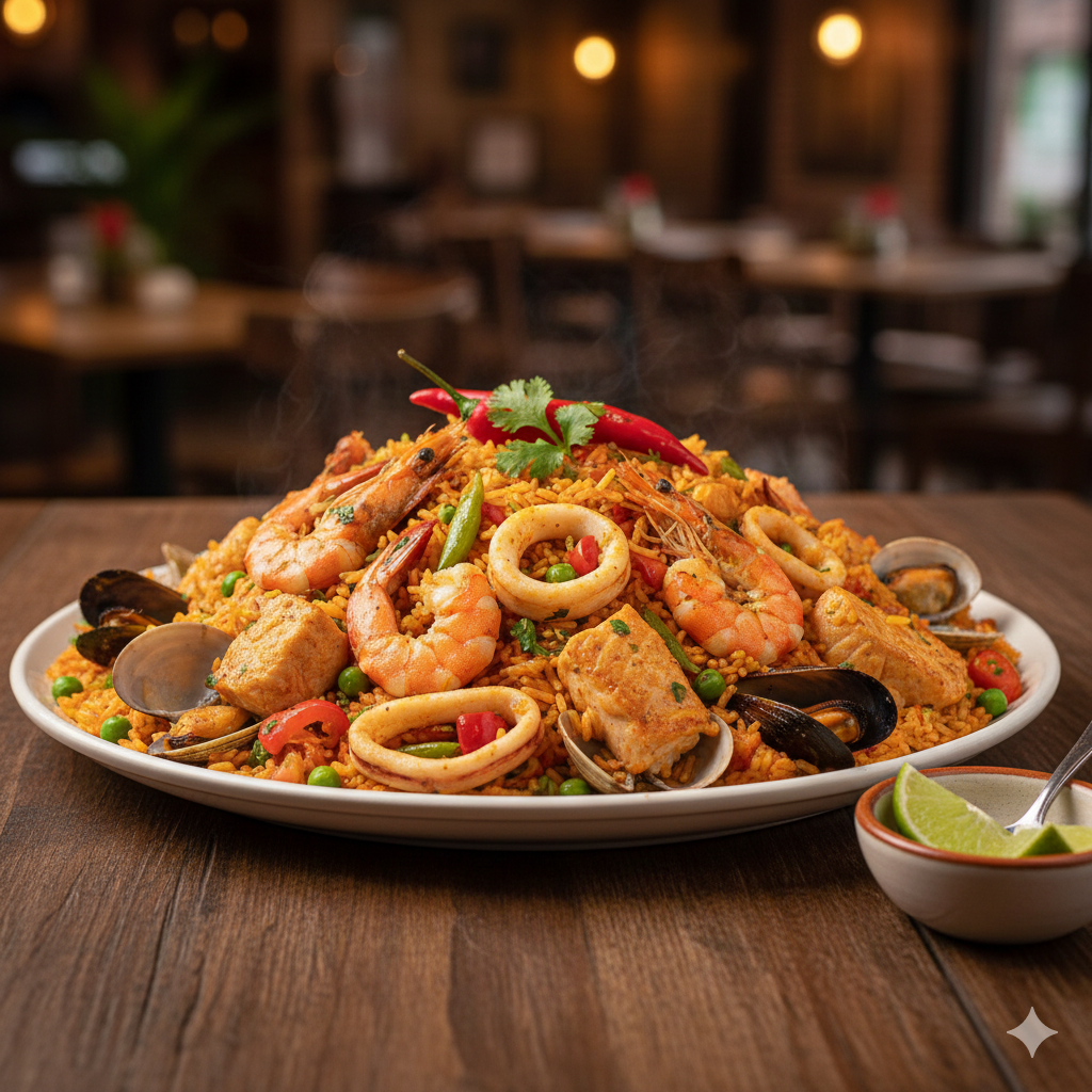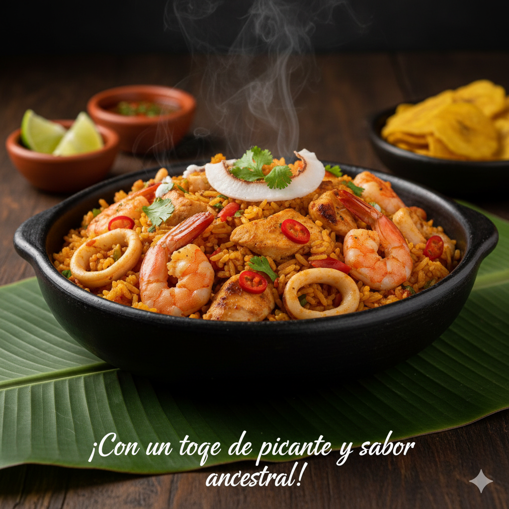 Exótica combinación de mariscos, pescado y pollo salteados, con arroz y un espectacular guiso ancestral del Pacífico Colombiano, con un toque de picante.