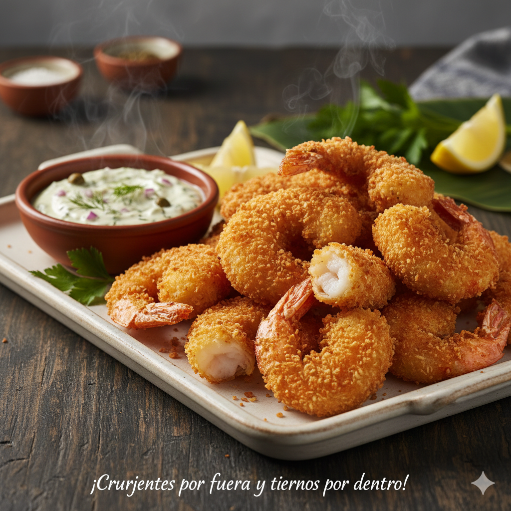 Camarones apanados, crujientes por fuera y tiernos por dentro, acompañados con salsa tártara.