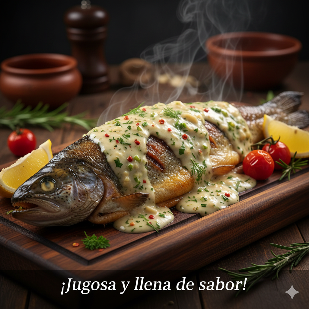 Trucha asada, bañada con una cremosa salsa a base de ajo y especias. Jugosa y llena de sabor.