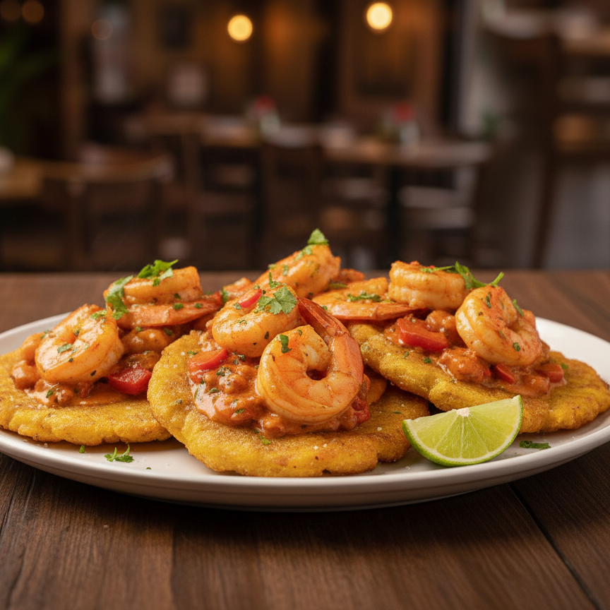 Cuatro patacones crujientes bañados con camarones sudados en nuestra exquisita salsa de coco ancestral. ¡Una explosión de sabor!