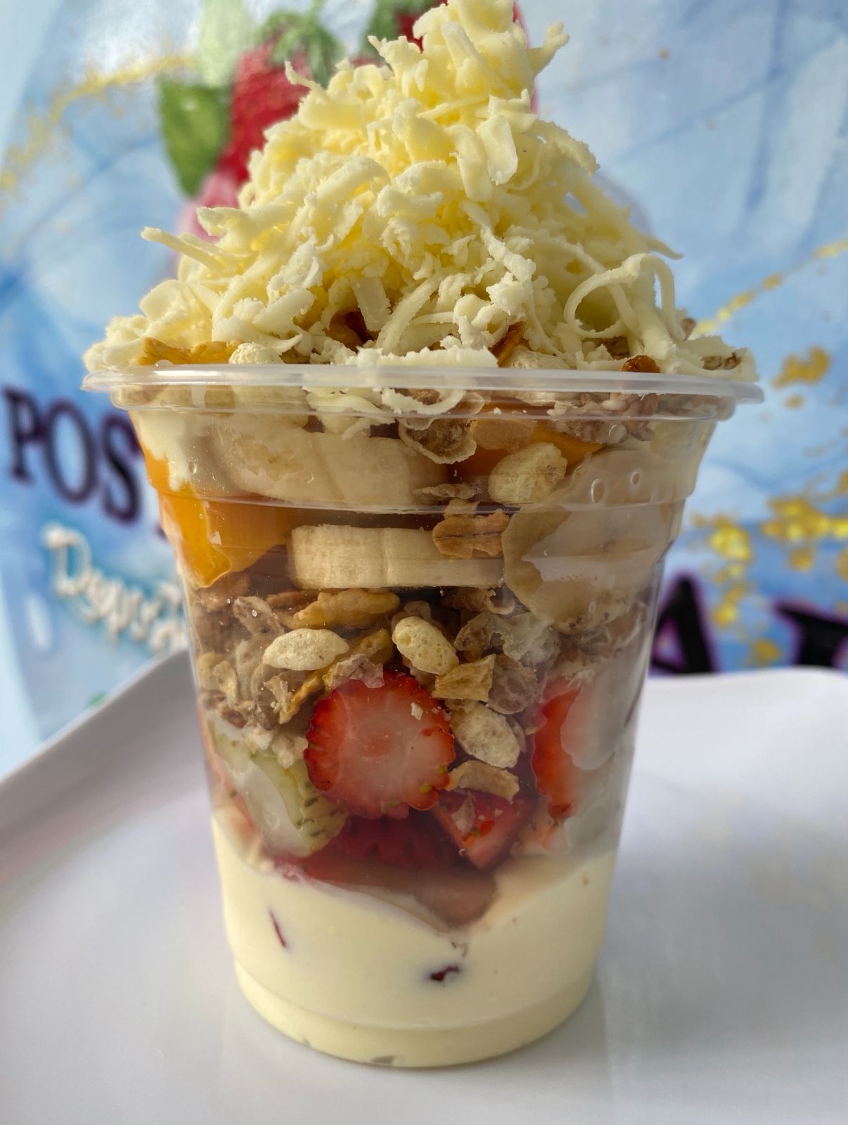 Yogurt griego, mango, fresa, papaya, manzana, banano, queso y granola 24 oz.