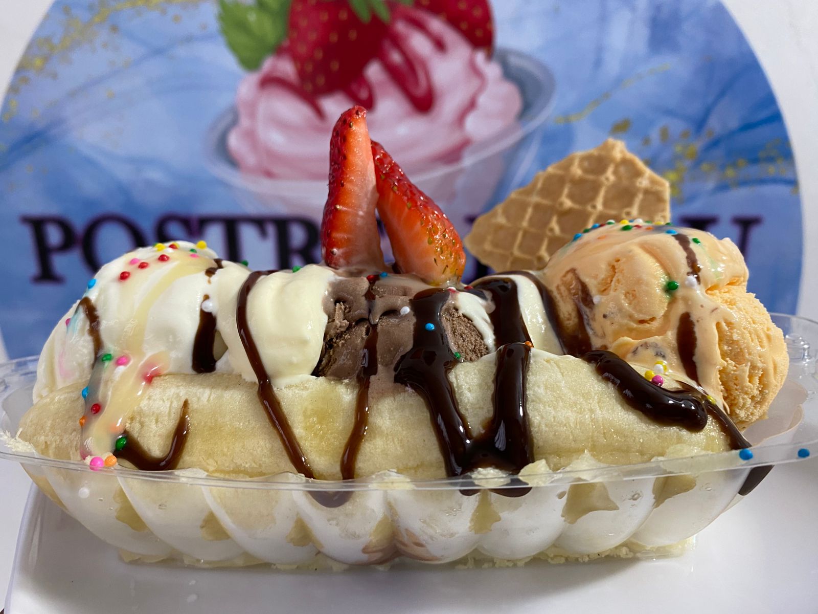 Banano, 3 bolas de helado, crema de la casa, fresa, barquillos y mermeladas y queso.