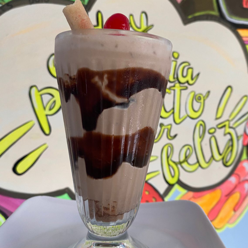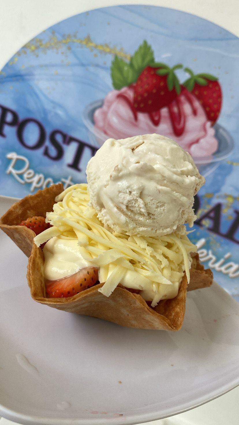 2 Bolas de helado de tu preferencia, queso mozzarella, crema de la casa y fruta.
