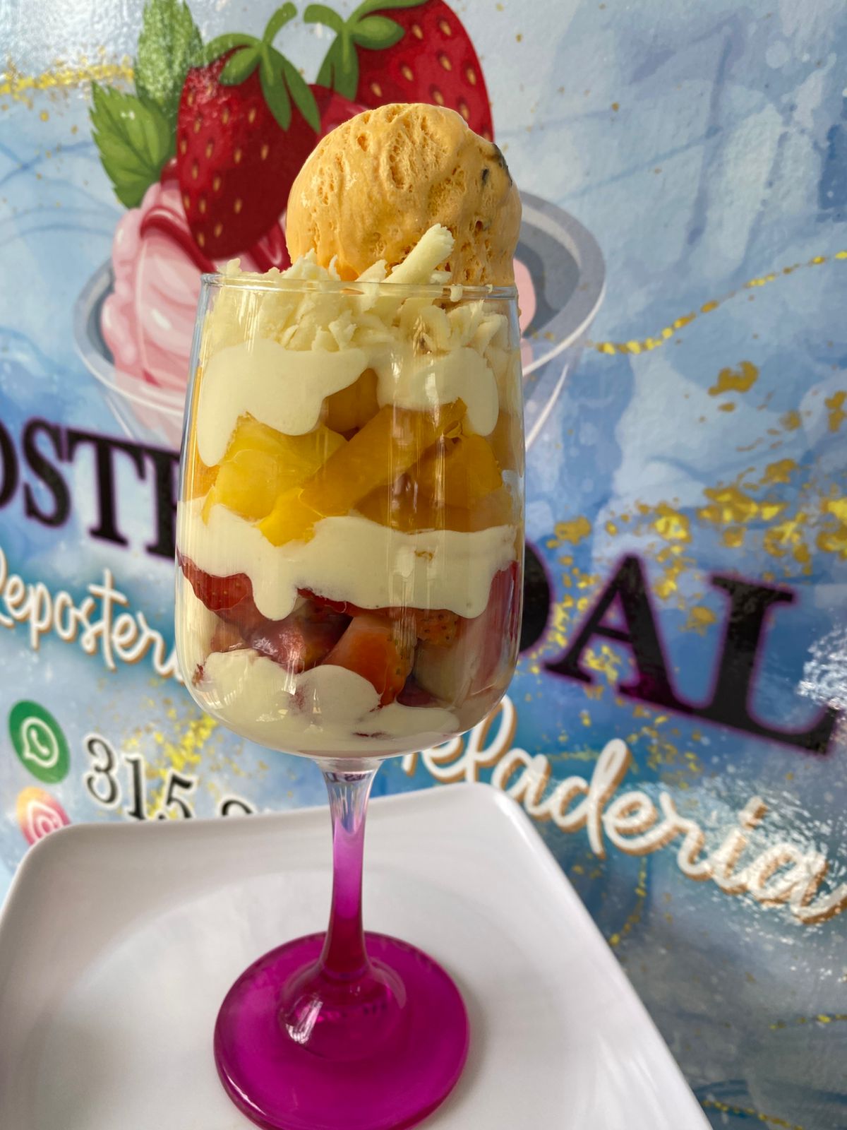 Crema de la casa, mango, fresa, papaya, manzana, banano, queso y 1 bola de helado.