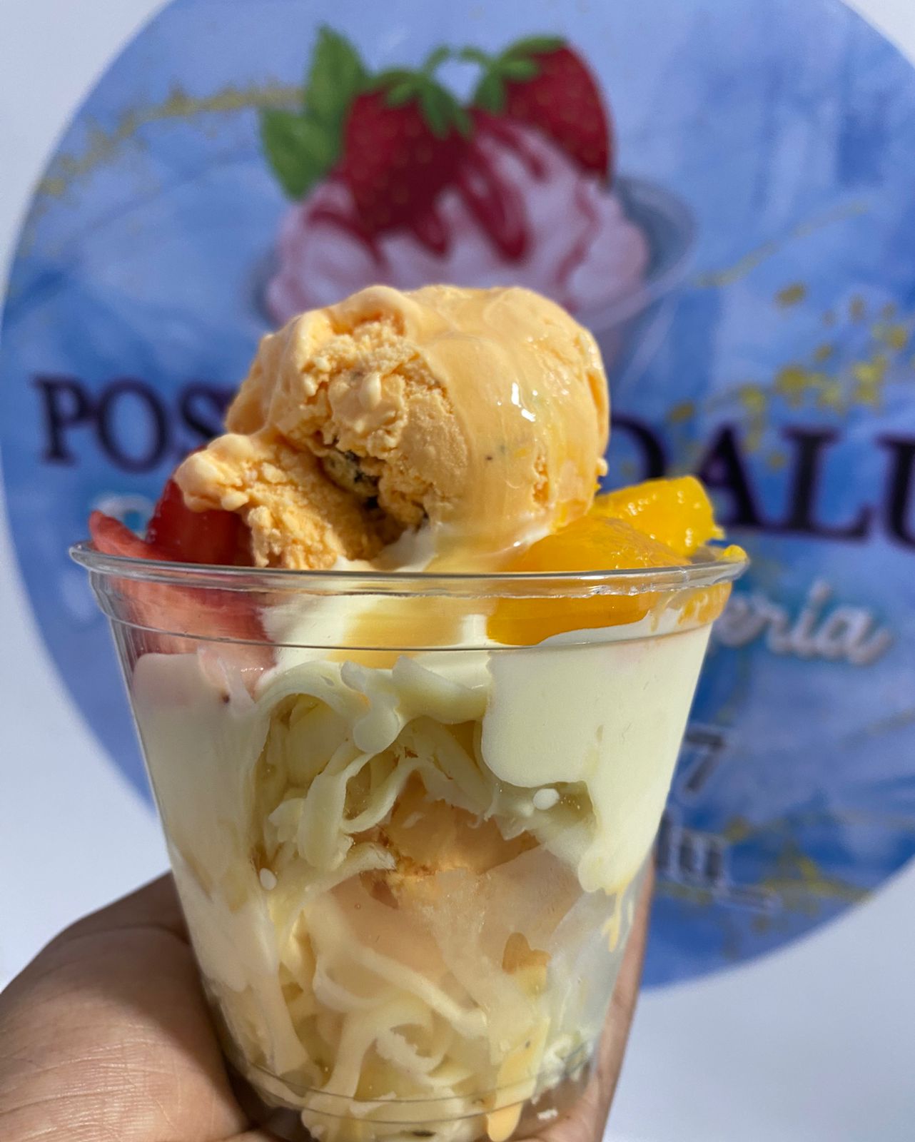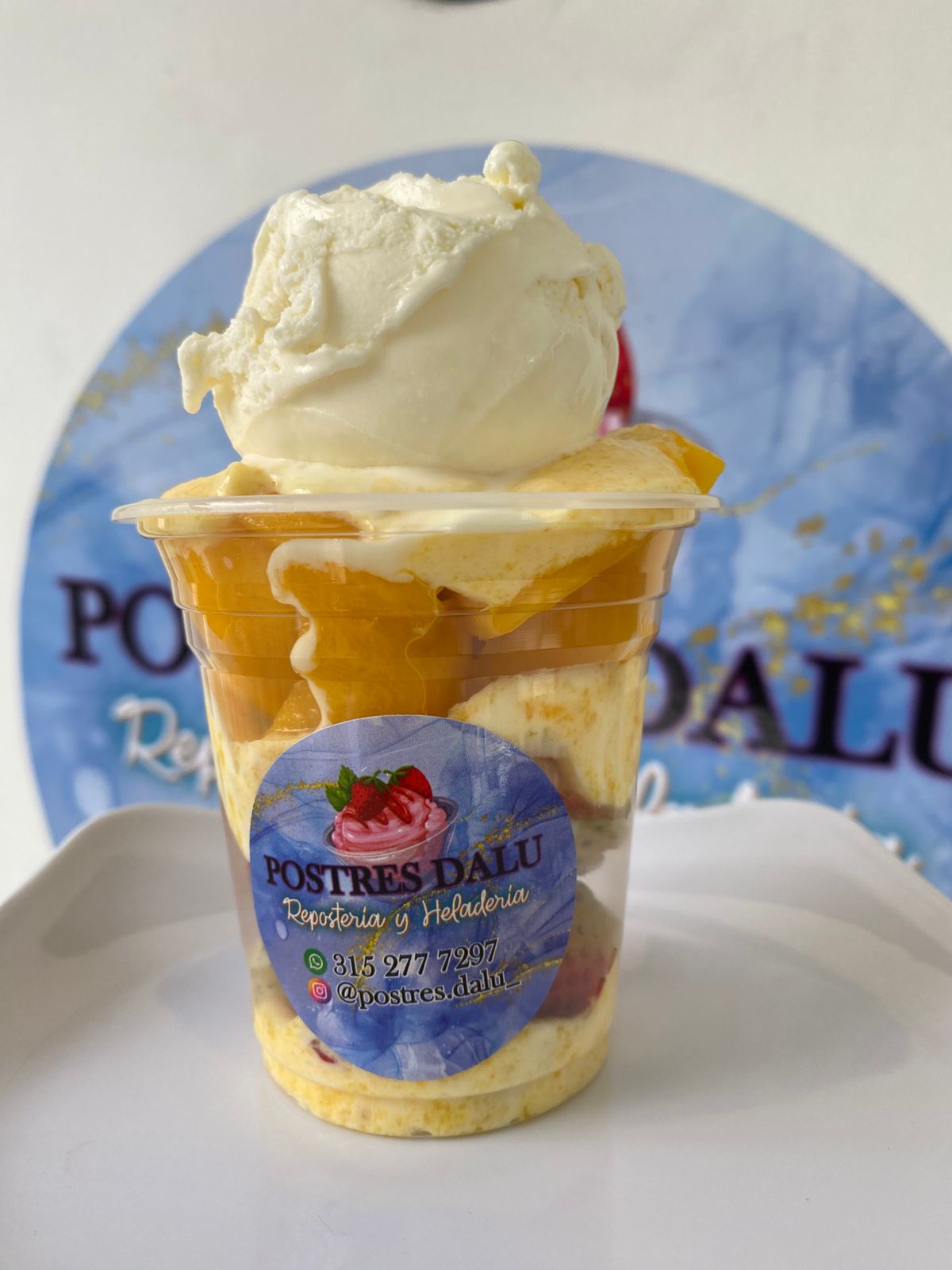 Fresas, trozos de mango con crema de la casa, lechera, mermelada, queso tamaño 9 oz.