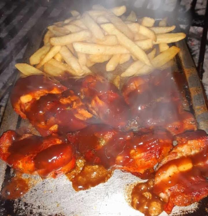 carne, pollo, costilla ahumada, chorizo, papas a la francesa, maduro frito.