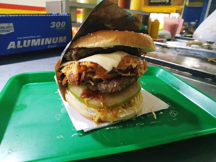 Hamburguesa doble carne, queso,ripio,tocineta,pollo desmechado,tomate,salsas de piña,de tomate,rosada,chowi,mostaza.