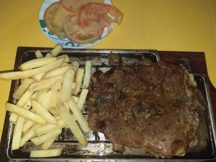 Acompañado de papa a la francesa y ensalada (cebolla, tomate y lechuga).