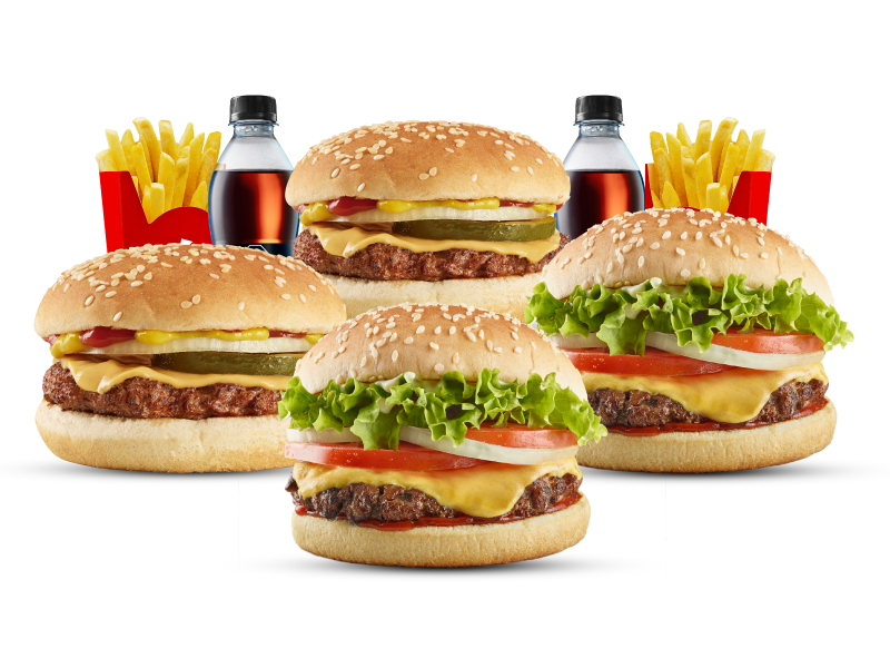 2 Hamburguesas Súper Presto, 2 Cheeseburger, 2 papas grandes y 2 gaseosas 400 ml.