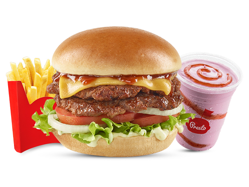 Hamburguesa doble carne de 208gr (104gr c/carne) con doble queso, cebolla, tomate, lechuga, salsa presto y de tomate, 1 papas medianas, 1 gaseosa 400 ml