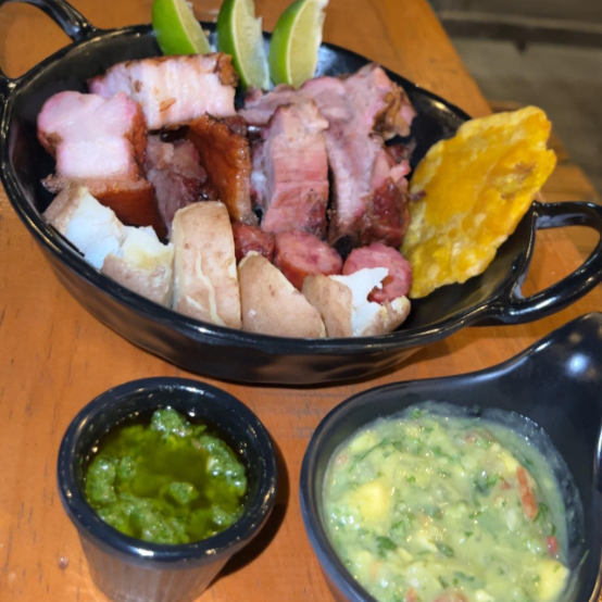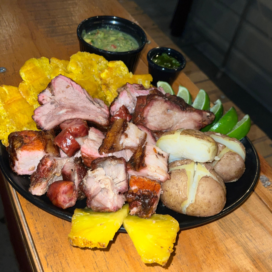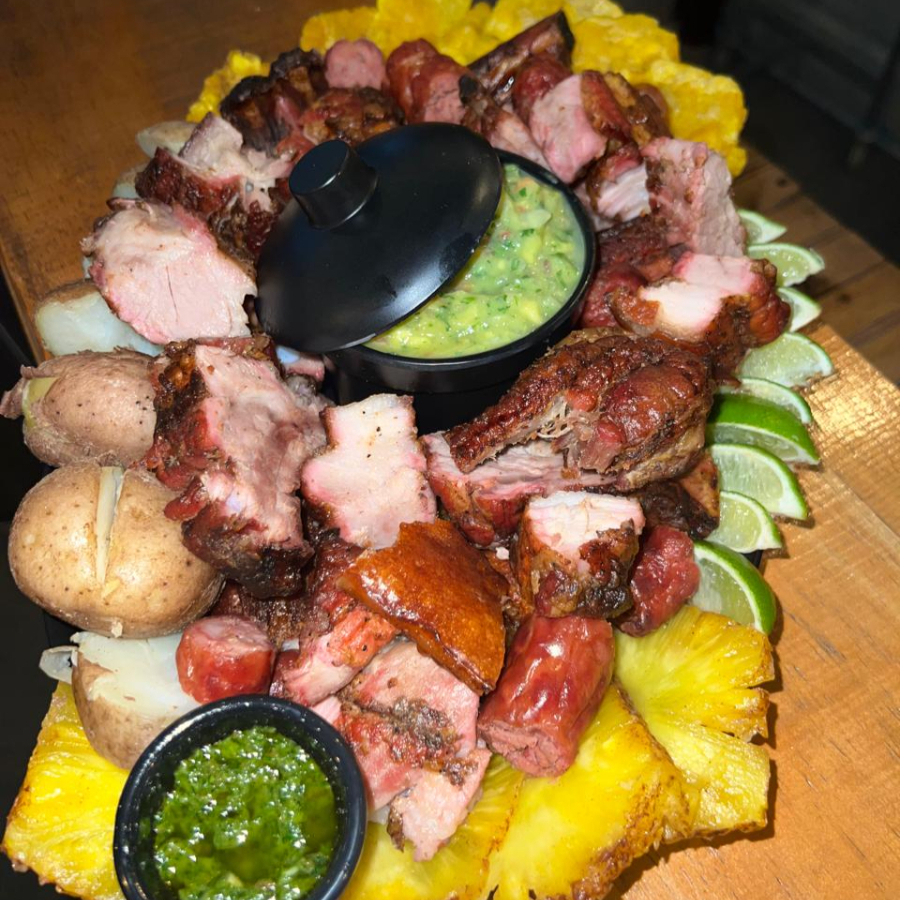 Selección de cortes de bondiola jugosa, costilla tierna, panceta crocante y chorizo artesanal, acompañados de papas rústicas, platanitos crujientes, guacamole fresco, y chimichurri