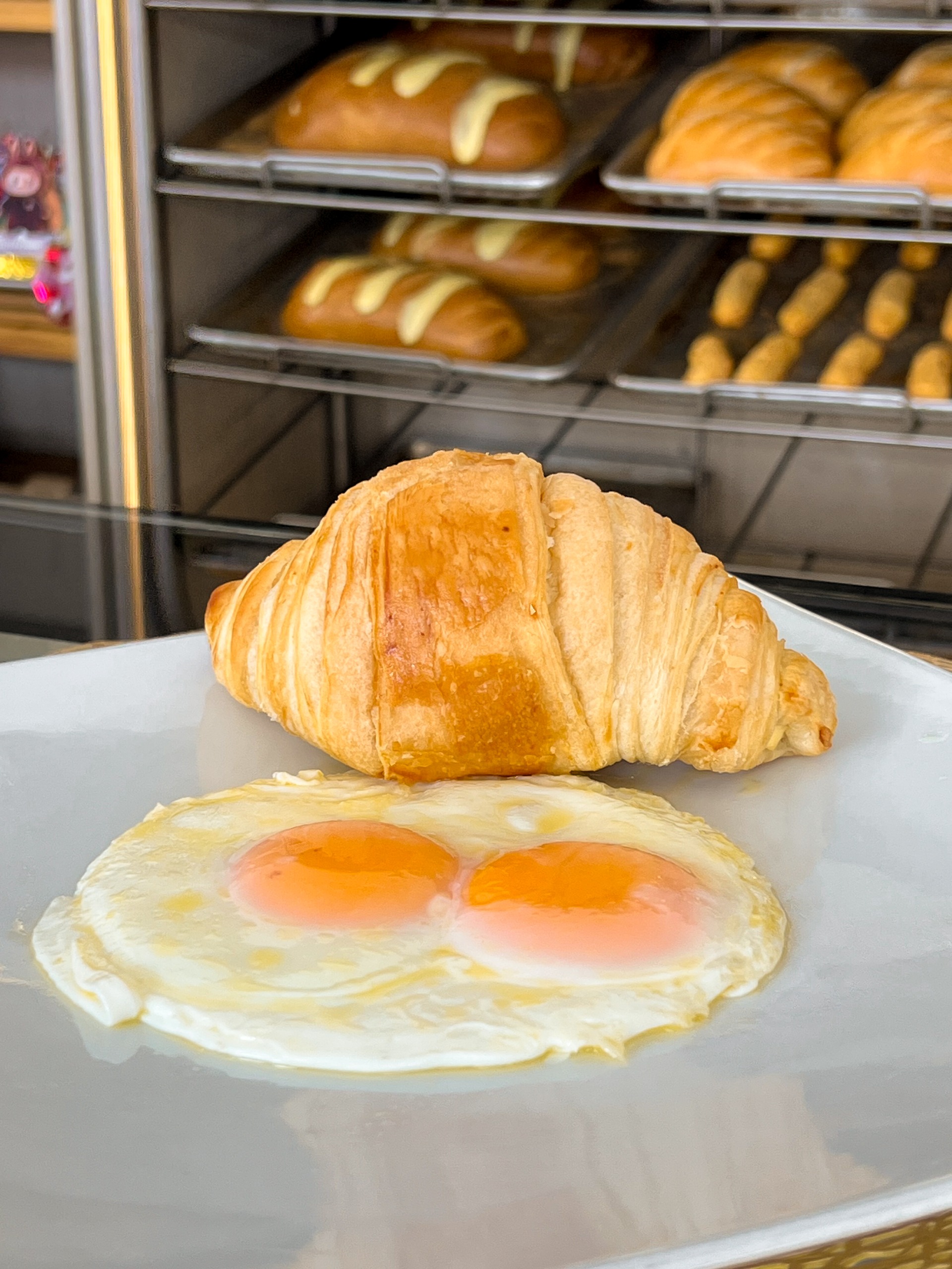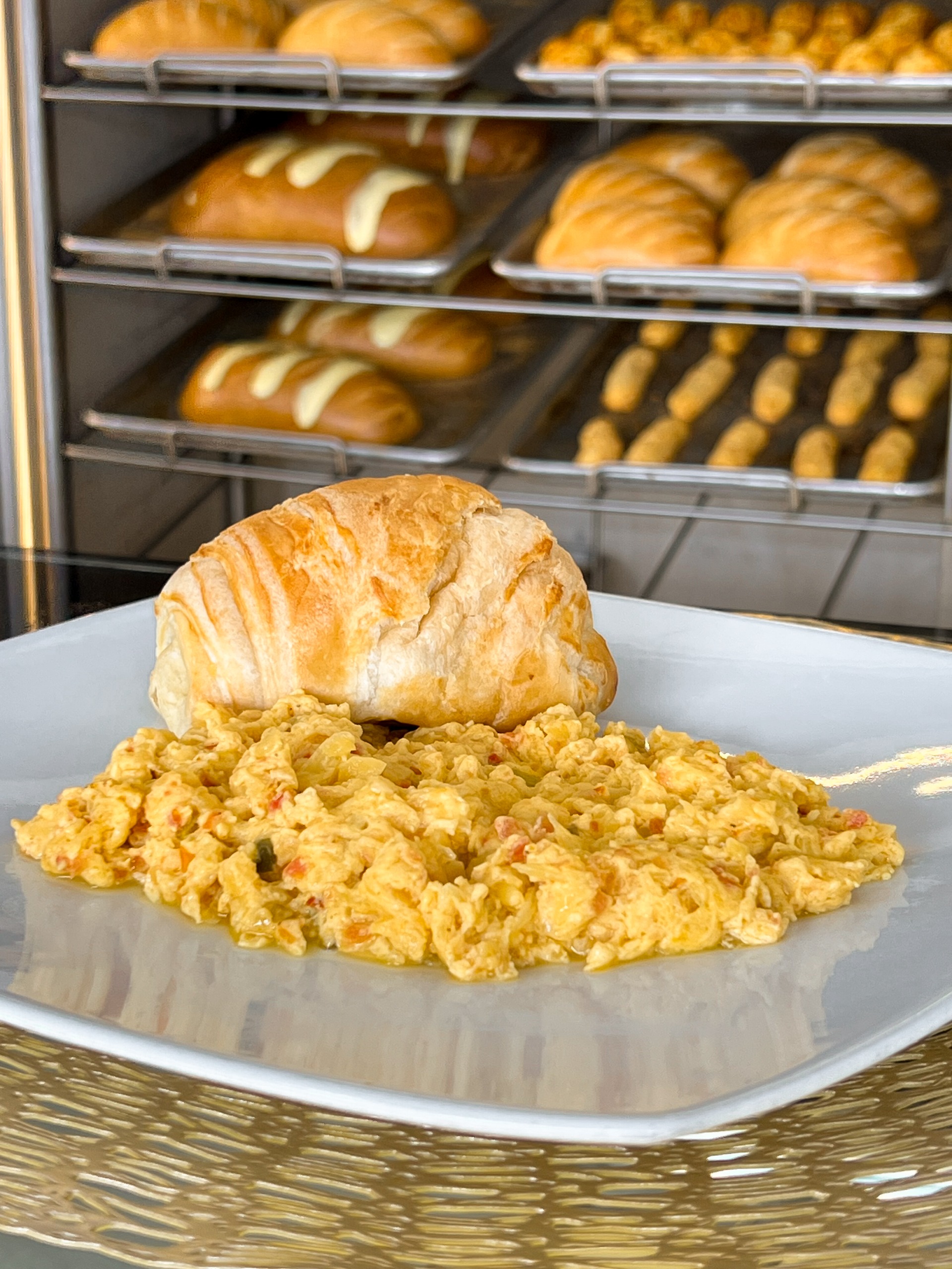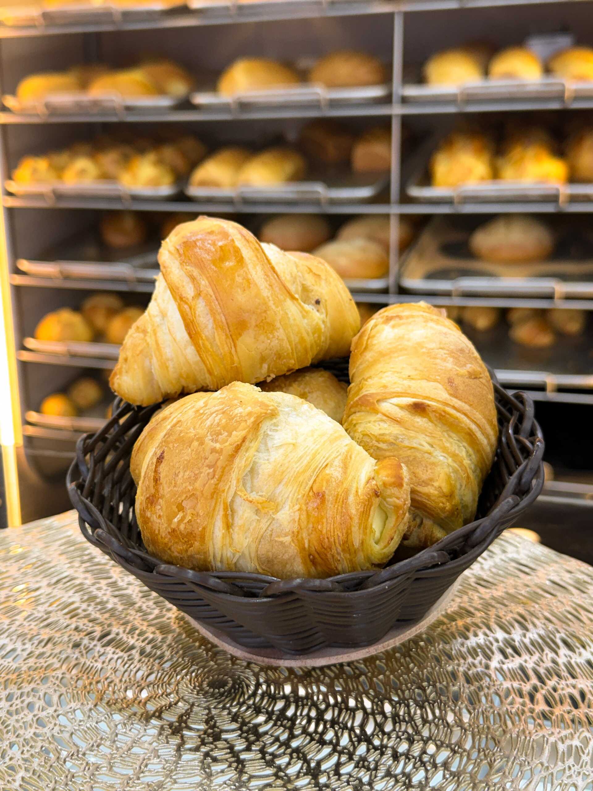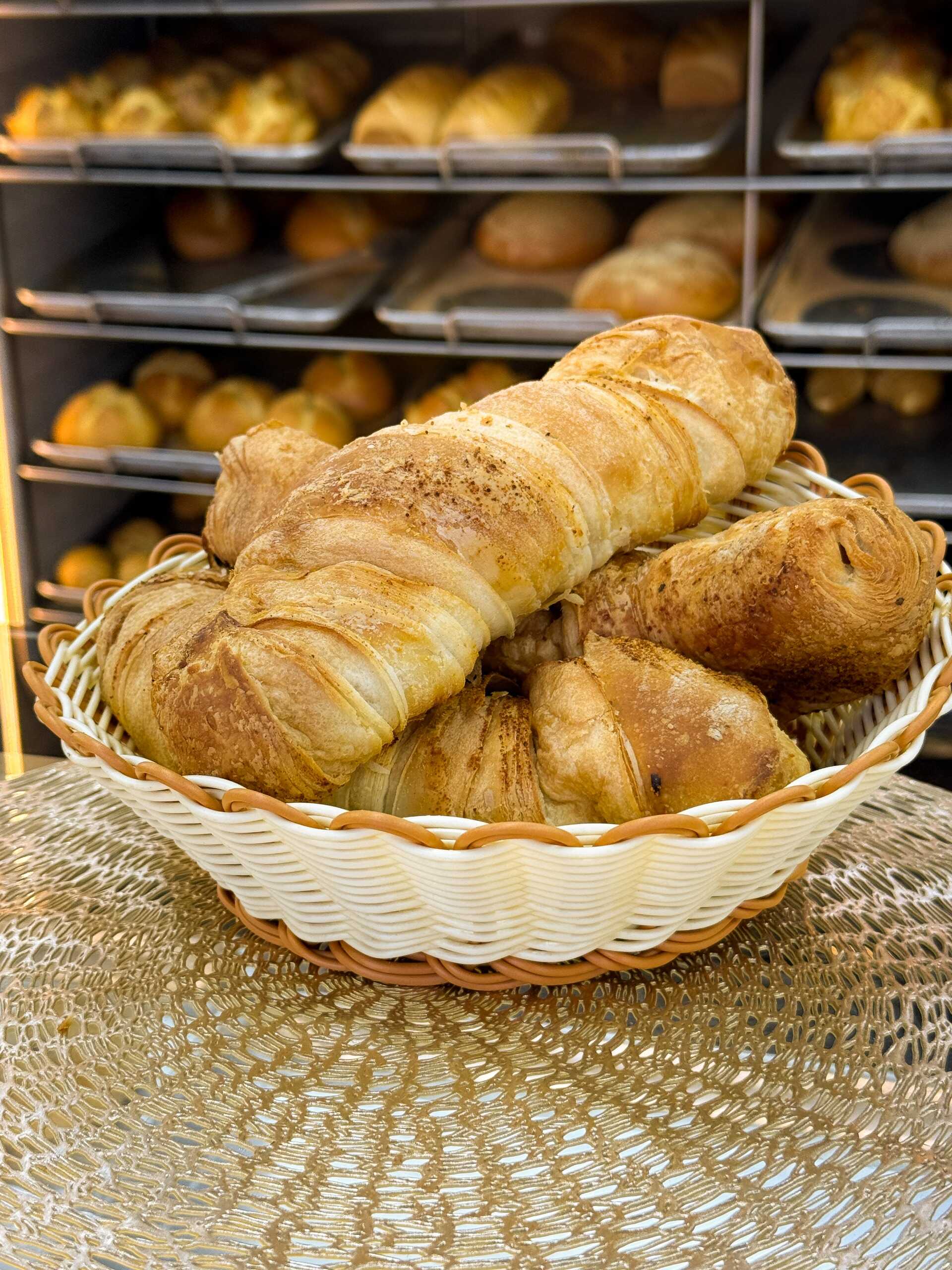 pan hojaldrado de cobertura crocante, interior suave, relleno con un trozo de de queso cuajada