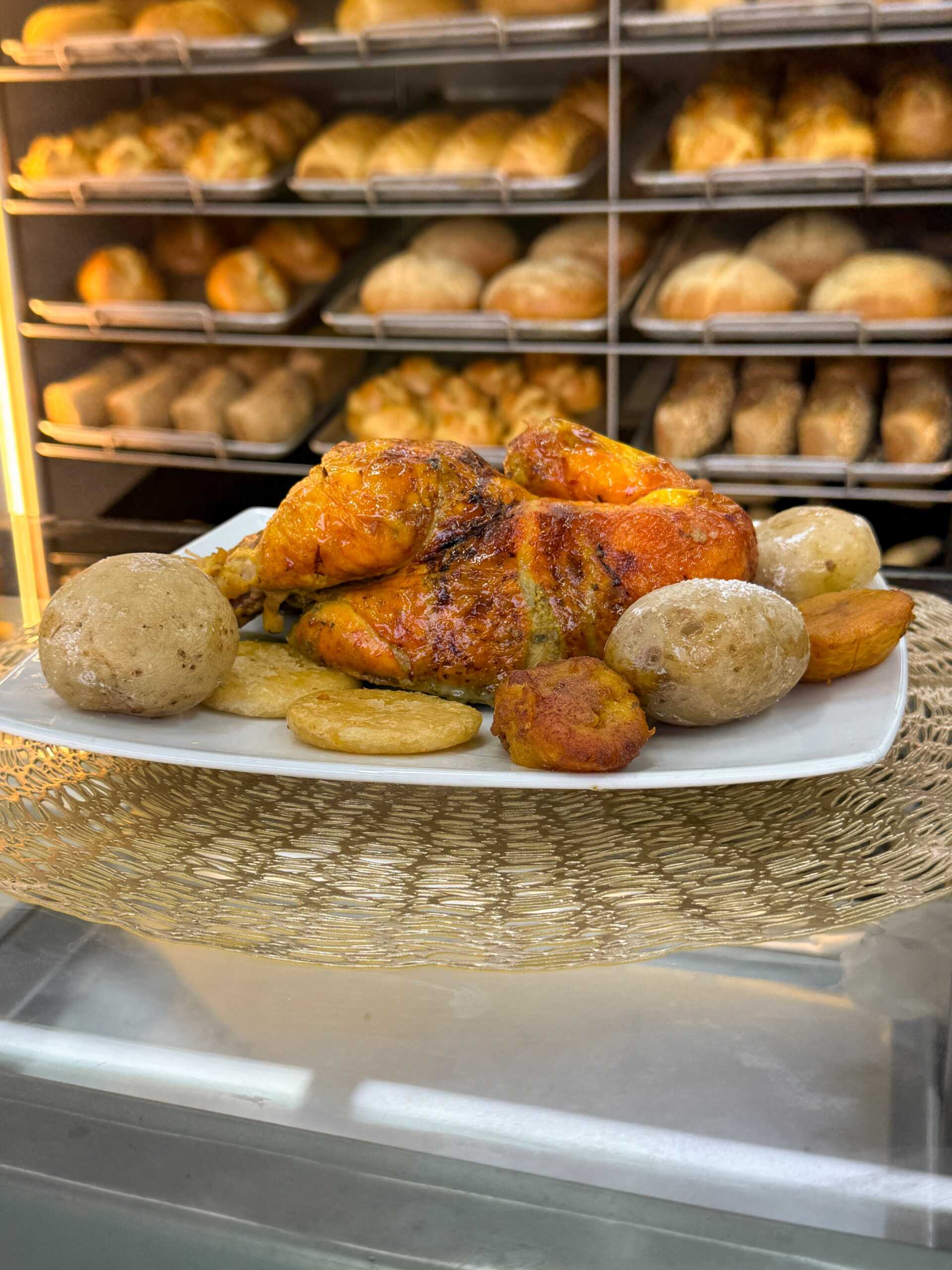 1/2 Pollo asado acompañado de papa salada más maduro más arepa.