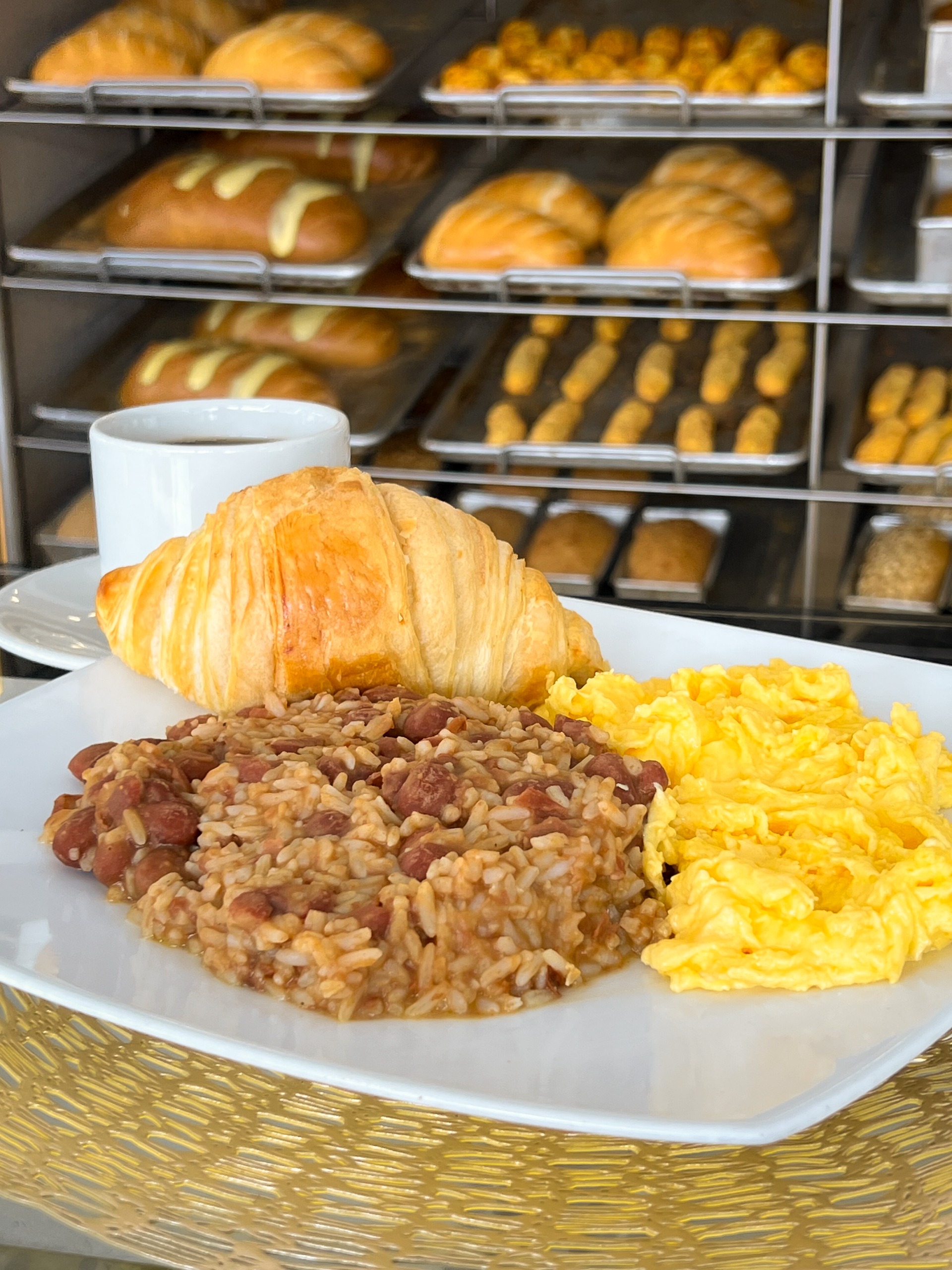 Revueltos con arroz más pan queso más bebida caliente a elegir (café negro 350 ml, café con leche 350 ml, chocolate 350 ml).