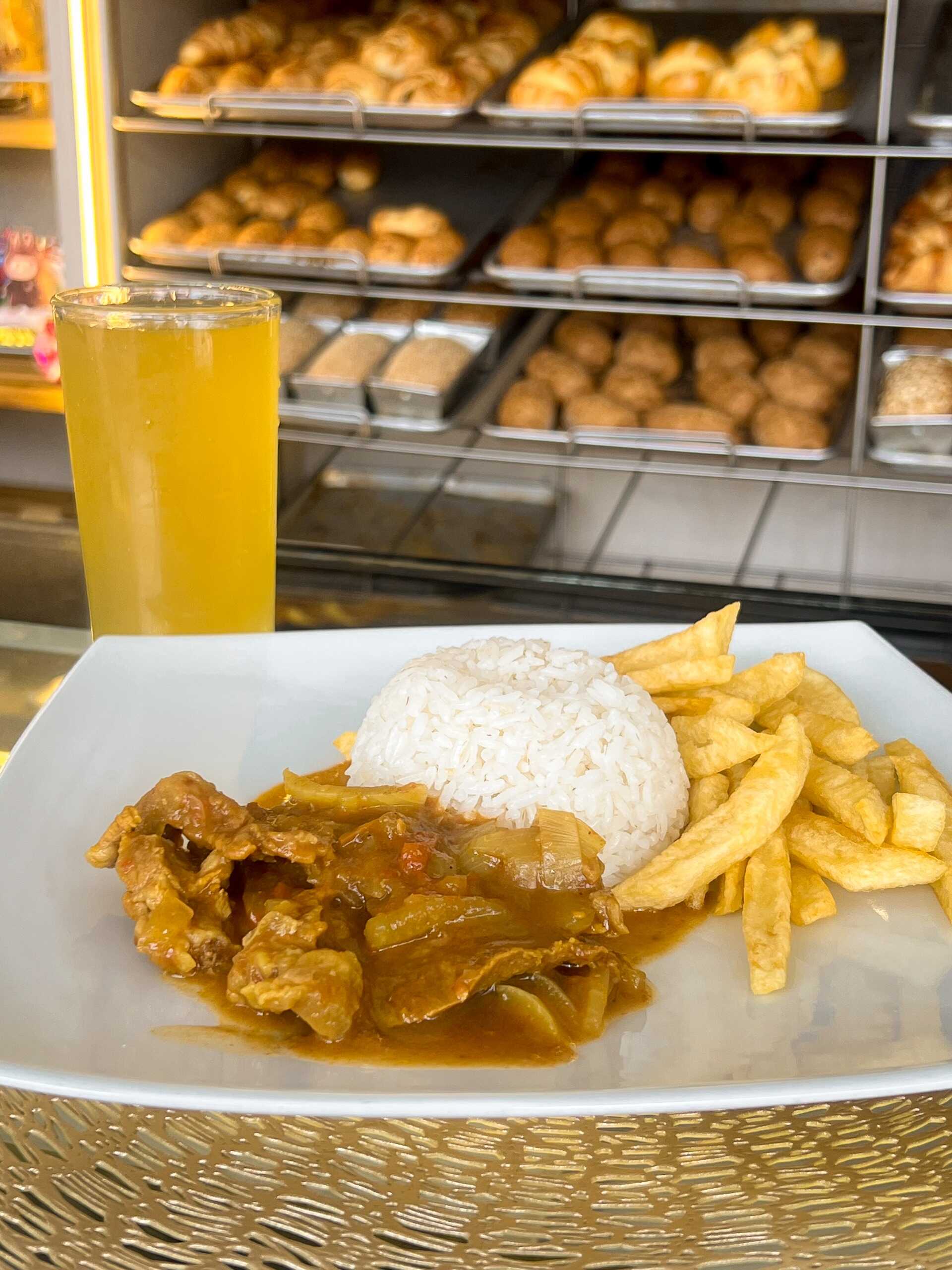 Bistec con arroz, papas, bebida caliente a elegir (café negro 350 ml, café con leche 350 ml, chocolate 350 ml).