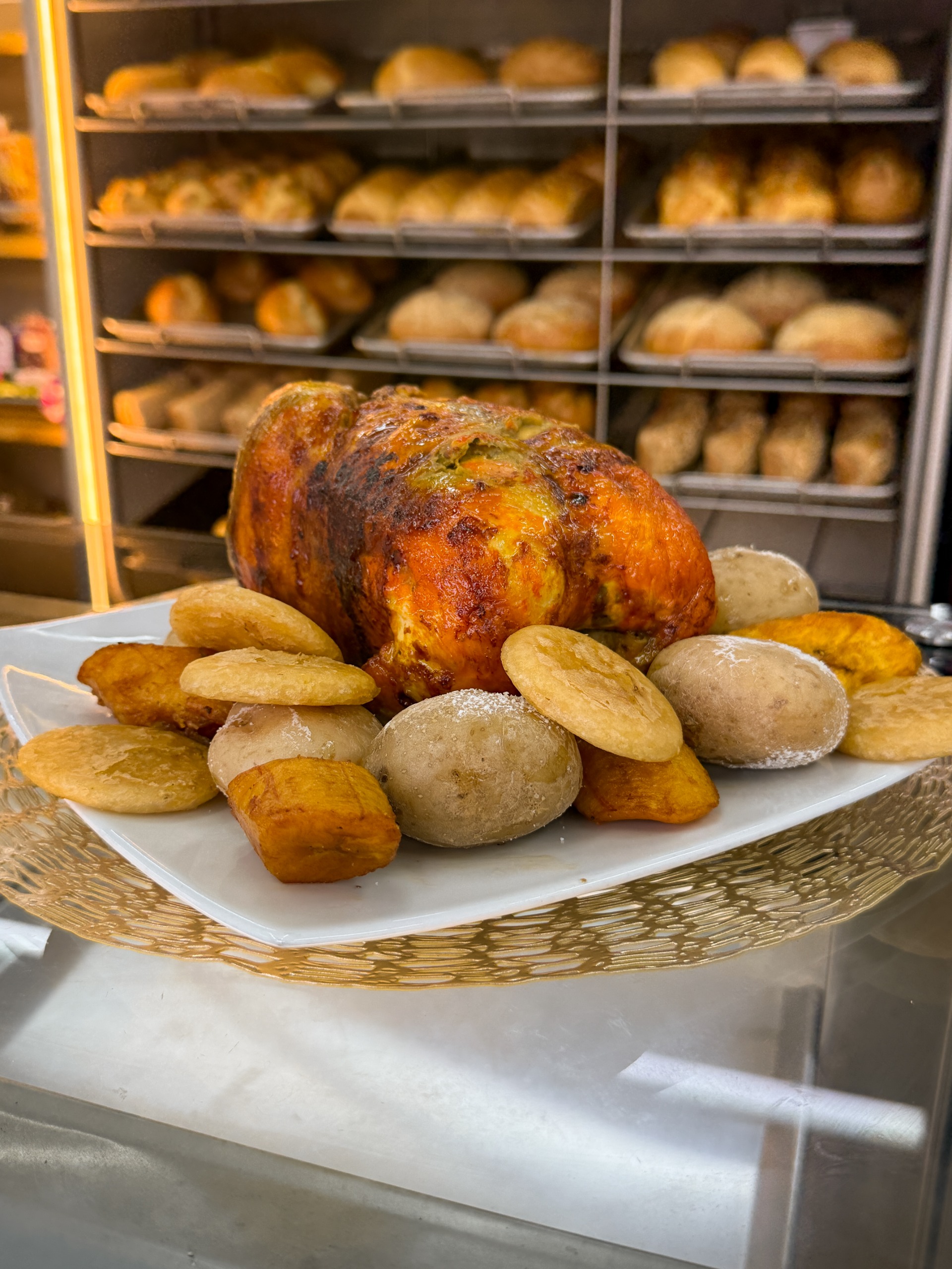 1 Pollo asado acompañado de papa salada más maduro más arepa.