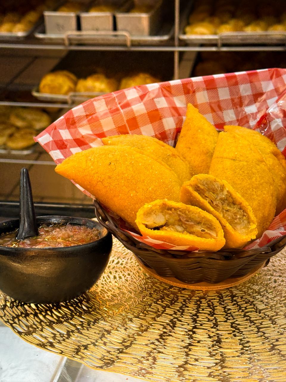 Empanada con masa de maíz crujiente, rellena con carne desmechada guisada y papa.