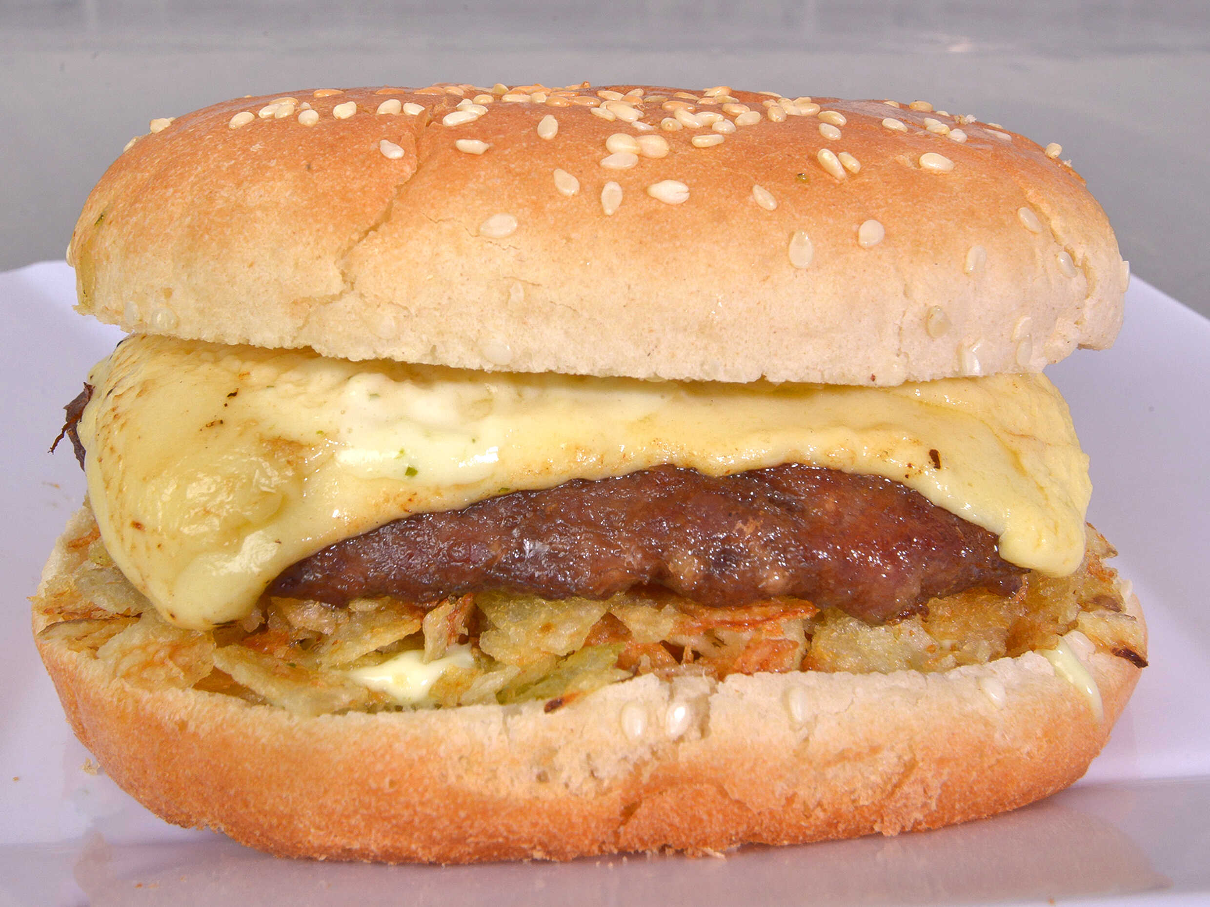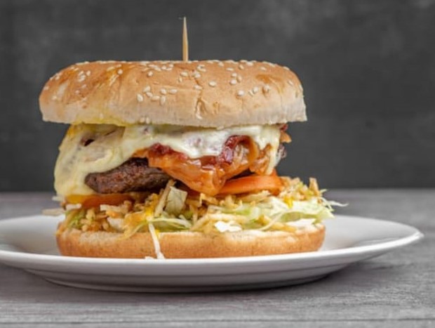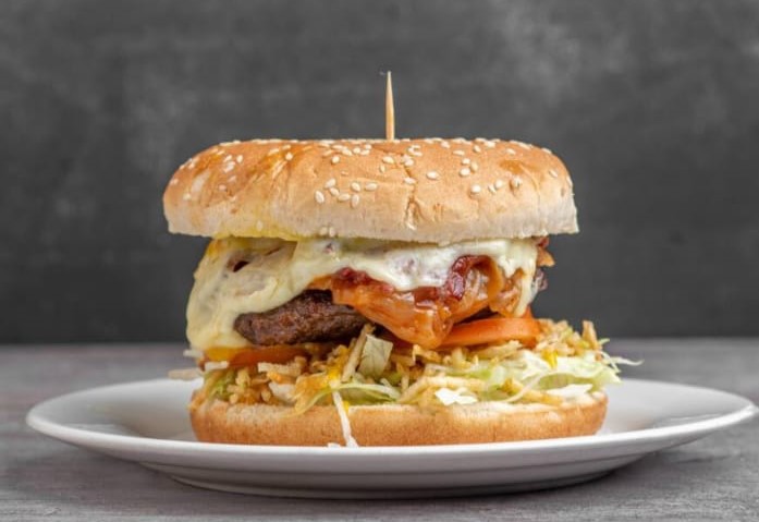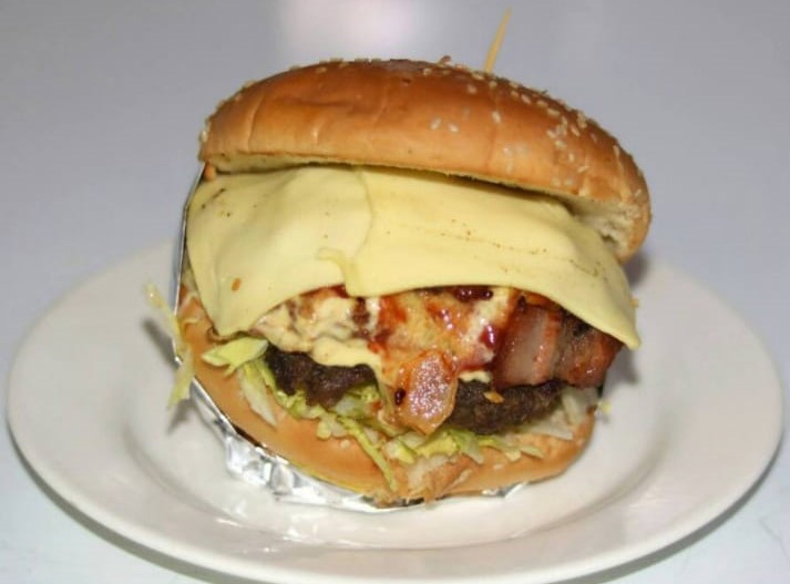 Pan Bimbo, doble carne, doble queso, doble tocineta, lechuga, tomate, cebolla, ripio y salsas.