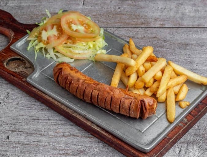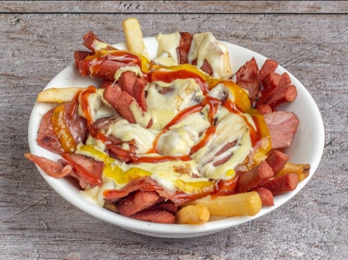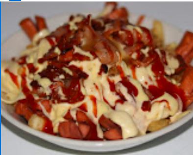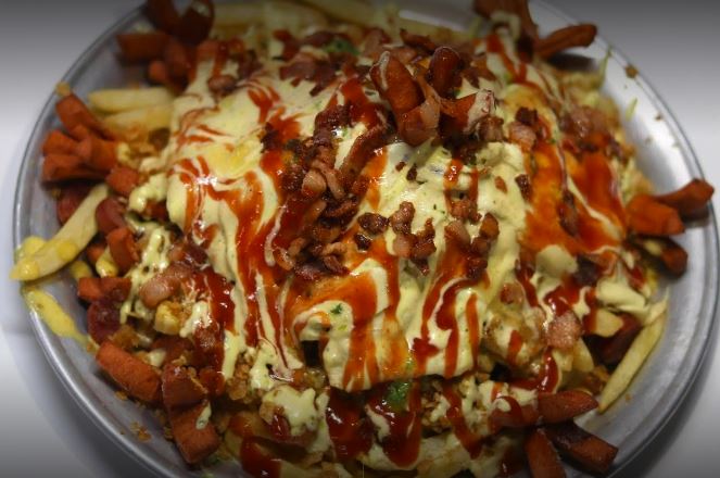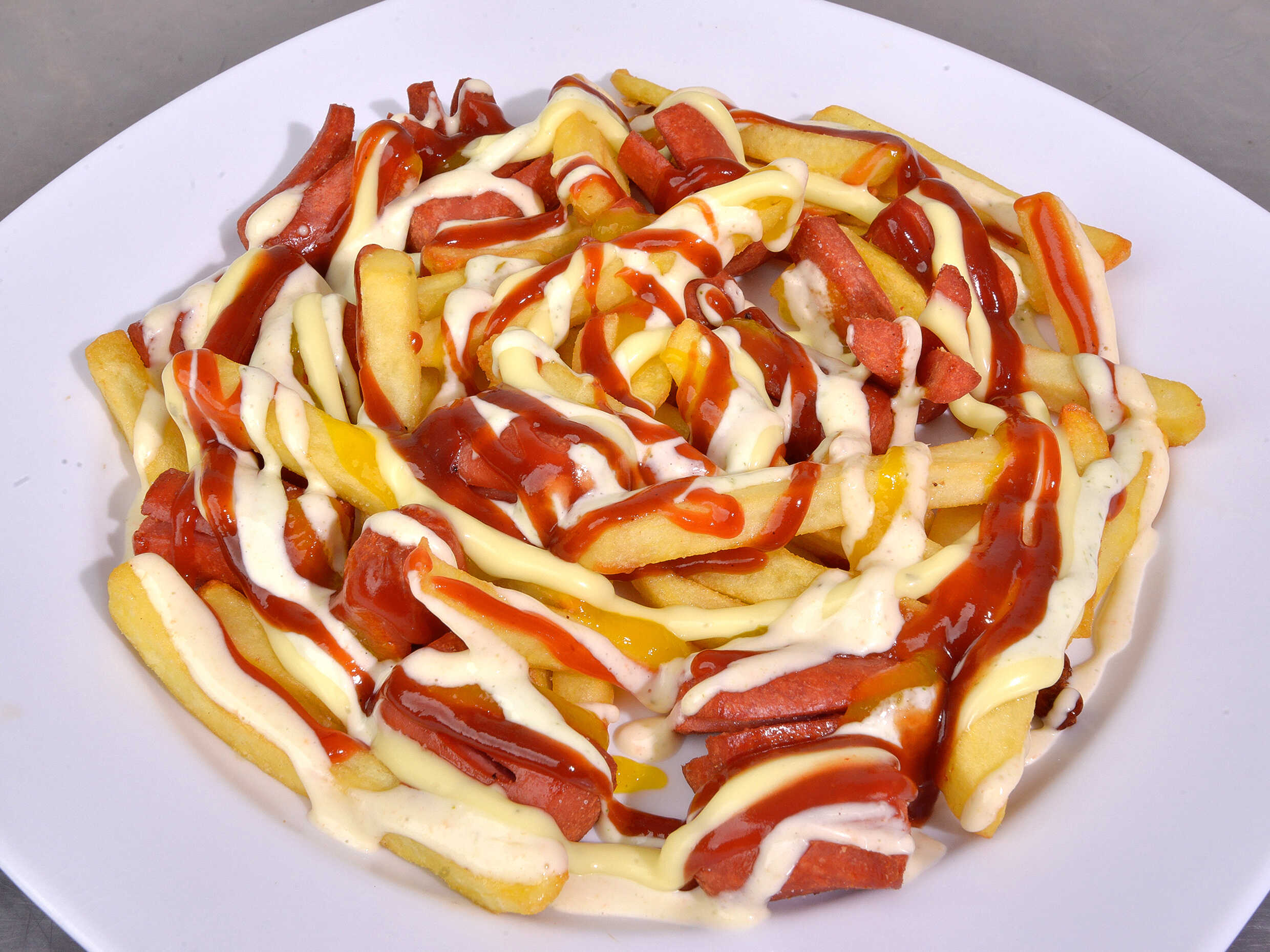 Salchicha rica, tocineta, queso, ripio, papas a la francesa, salsas.