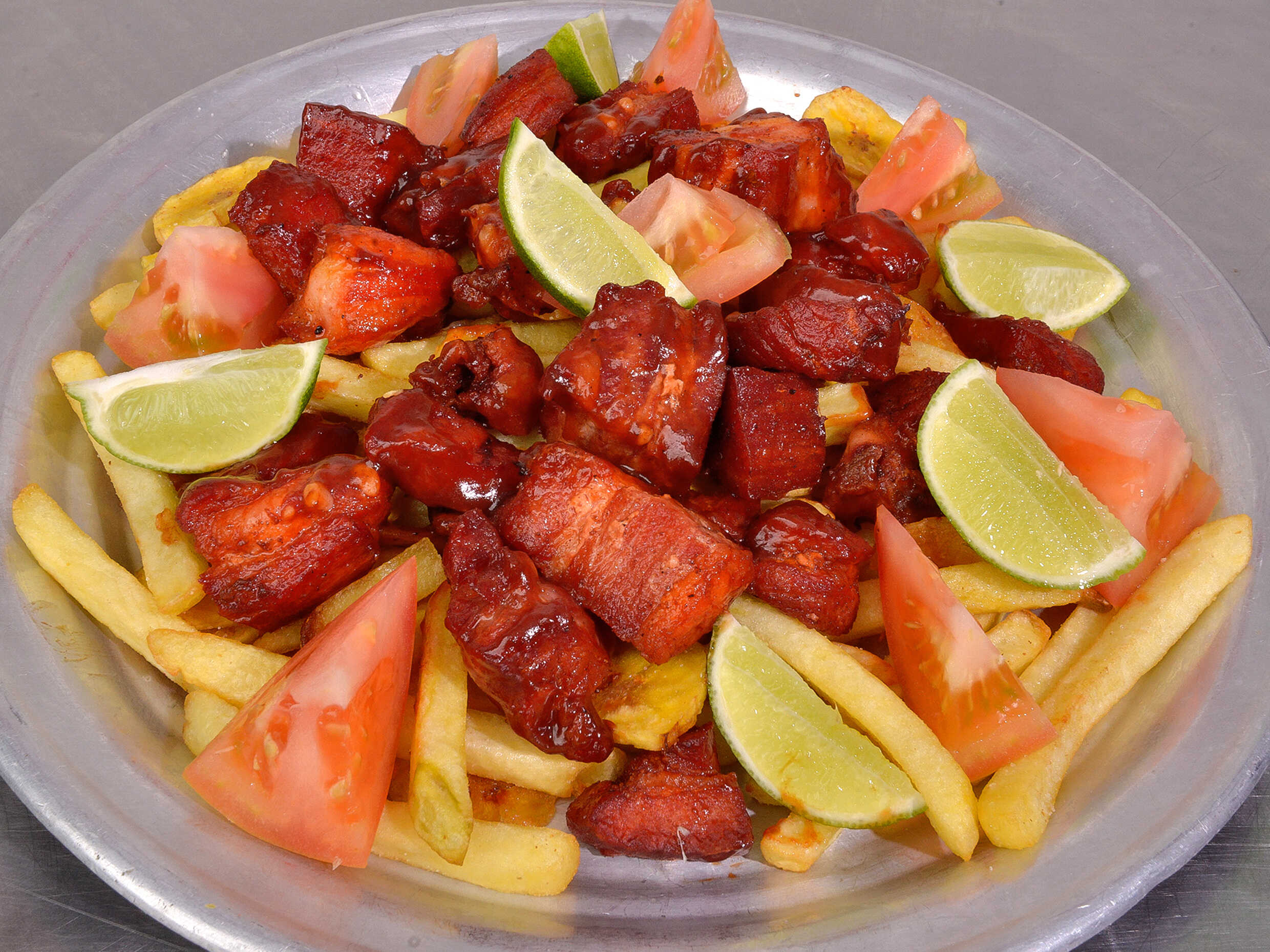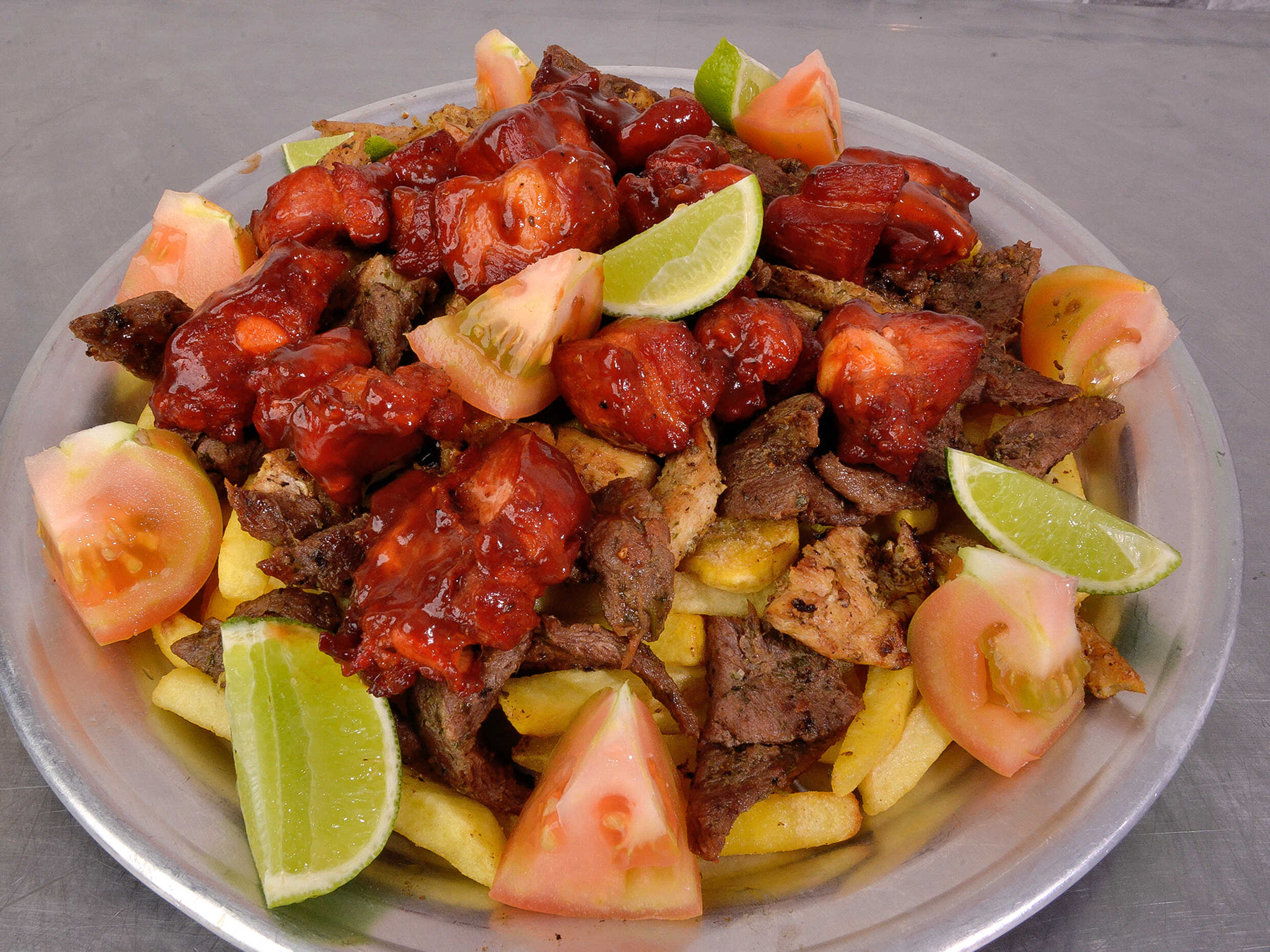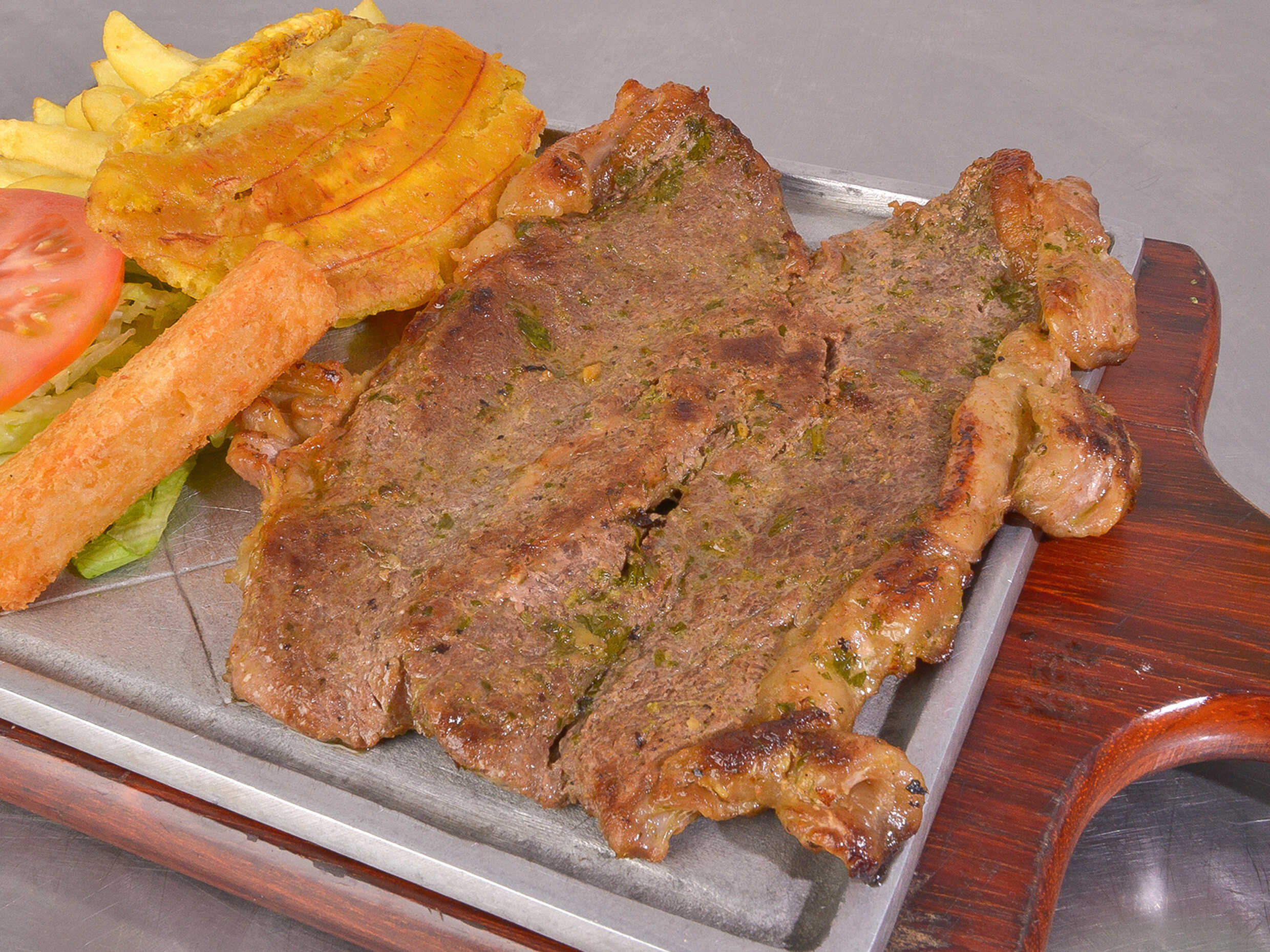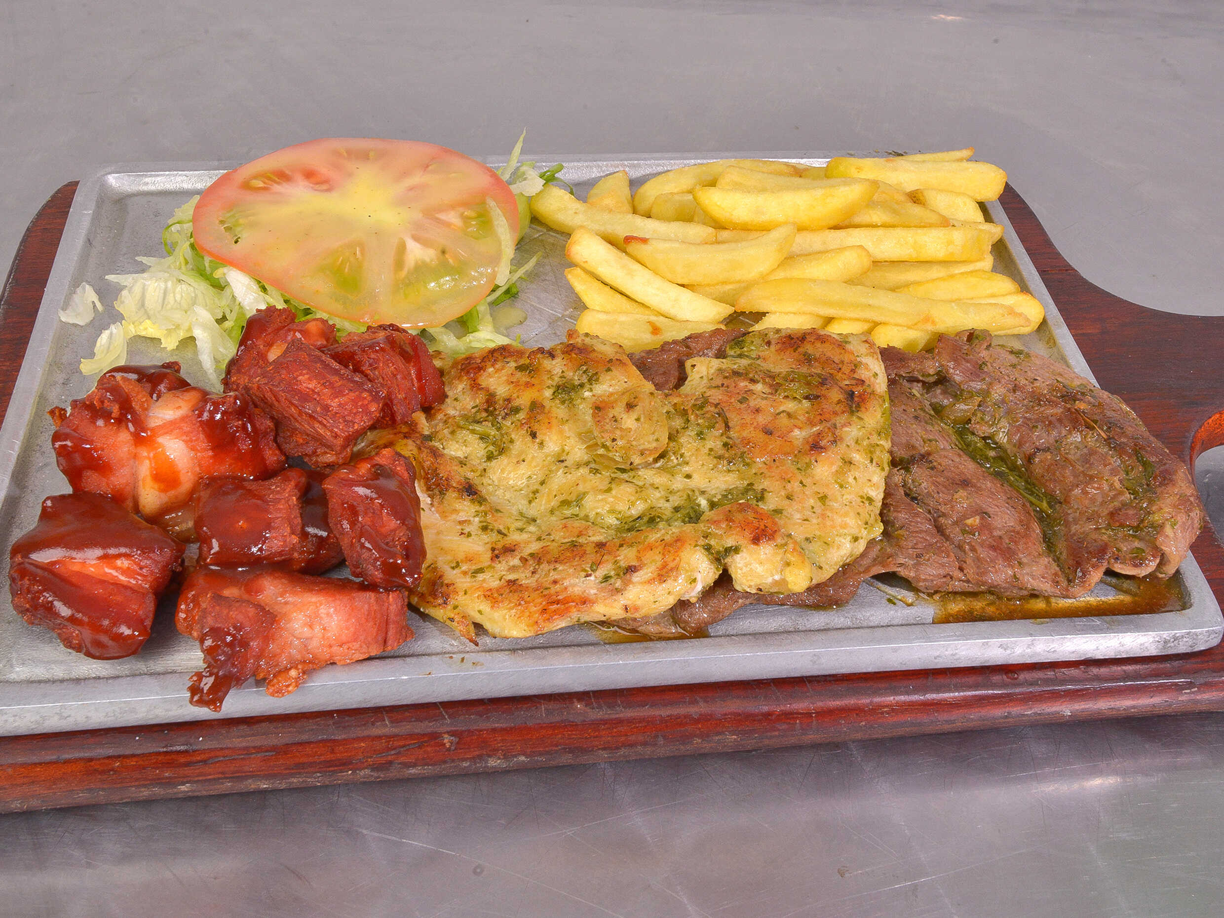 Filete de res, filete de pollo, costilla de cerdo, chorizo, papa a la francesa y ensalada (tomate, lechuga y vinagreta).